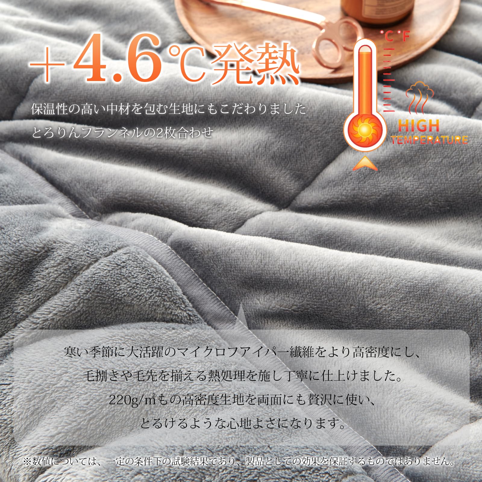 【4層構造で保温力倍増!】上層と下層はなめらかな肌触りのフランネル毛布で、その間にシンサレート綿と吸湿発熱中綿を挟んでいる。2枚合わせのサンドイッチ構造だから優れた断熱効果があり、保温性もより良い。保温力たっぷりの冬用毛布!