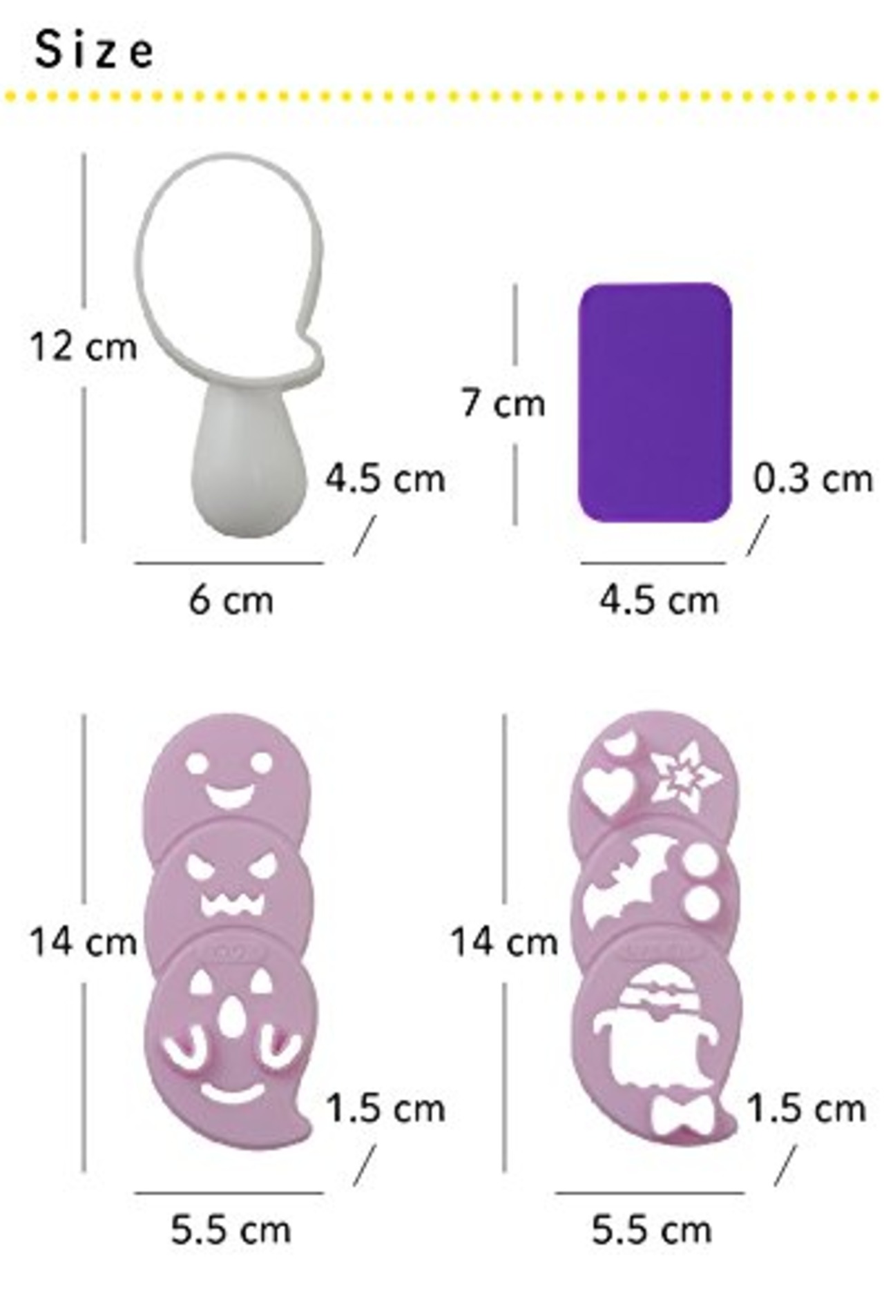 サイズ:(約) おにぎり型/ 全長12×幅6×高さ4.5cm 海苔カッター/縦14×横5.5×厚さ1.5cm 食材カッター/縦14×横5.5×厚さ1.5cm カッターマット/縦4.5×横7×厚さ0.3cm