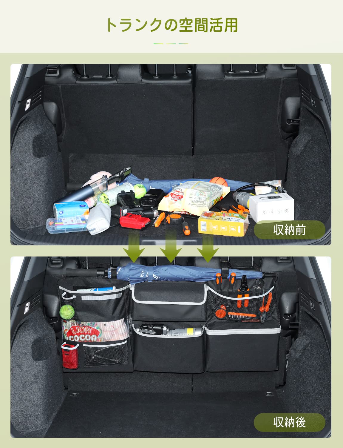 省スペース:散らかりがちな車のトランク内をスッキリ整理整頓できるトランク収納ポケット。105x45cmの立体収納設計、車内のスペースを有効活用して、散らかしがちな物を簡単に分類してスッキリ収納出来ます。