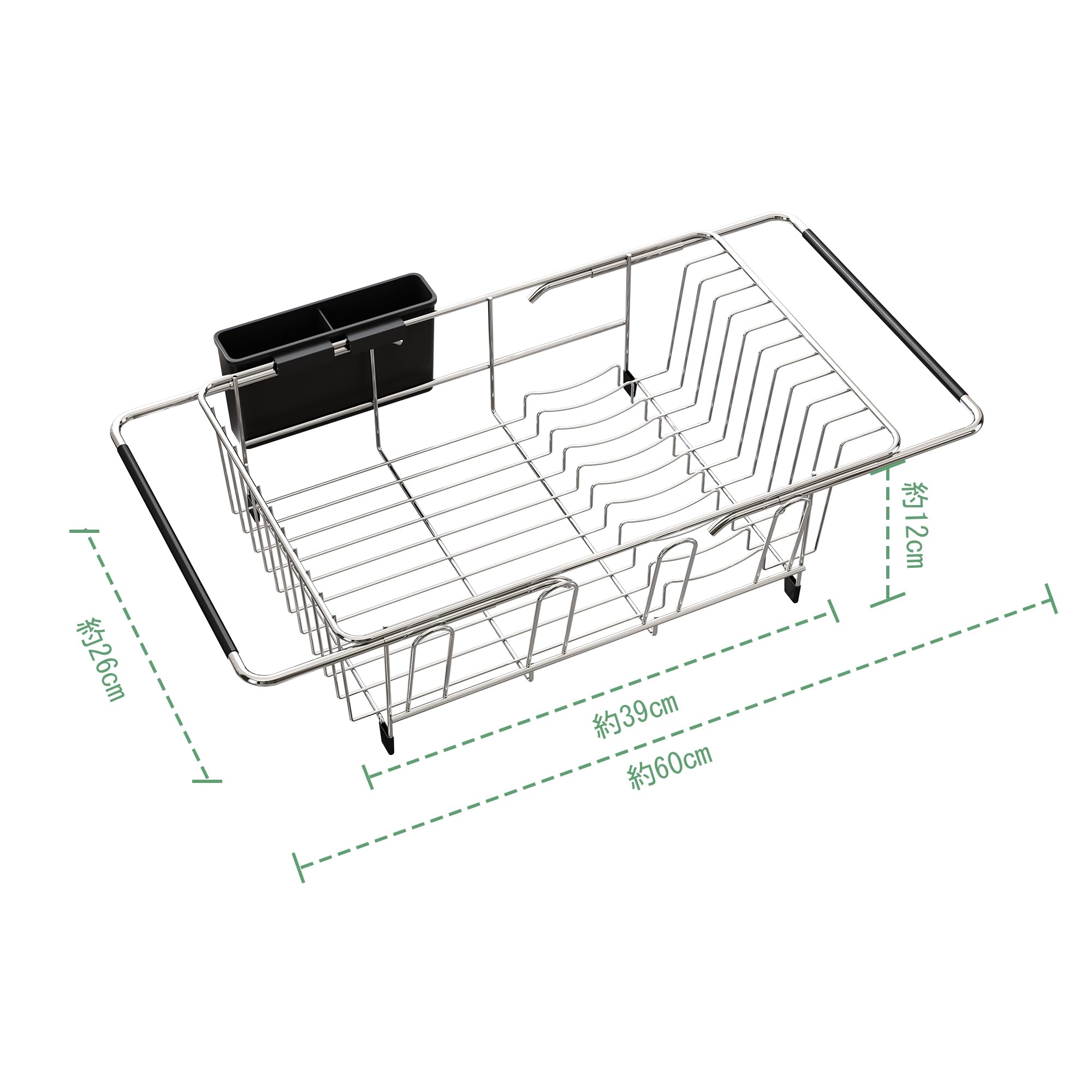 【伸縮式設計&省スペース】滑り止め付きの伸縮式アームがミズキリラックのシンクへの落下を防ぎ、安定性を高めます。水切りかごのアームは約40cmから60cmまで長さを調節でき、シンクのサイズに合わせて調整できます。シンクの上でもシンク内でも使用できます。