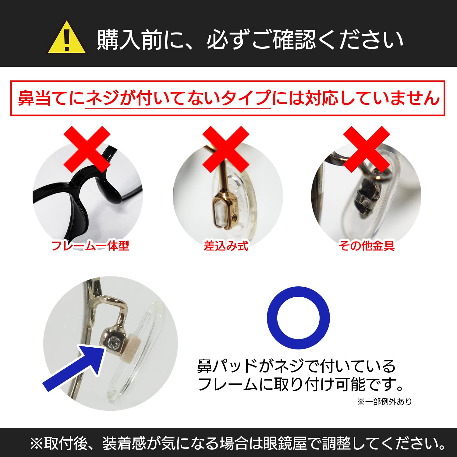 注意:※鼻パッドがついていない眼鏡、鼻パッドがネジで留められていない眼鏡には対応しておりません。※装着感には個人差があります。※アレルギー反応があった場合は速やかに使用を中断し、医師にご相談ください。