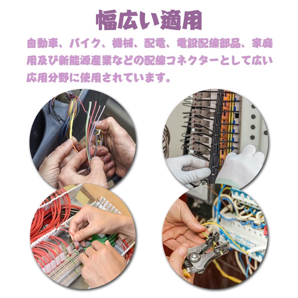 ◇使用範囲:自動車、バイク、機械、配電、電設配線部品、家庭用及び新能源産業などの配線コネクターとして広い応用分野に使用されています。電子機器の修理、絶縁工事、技術者、素人による修理に最適です。