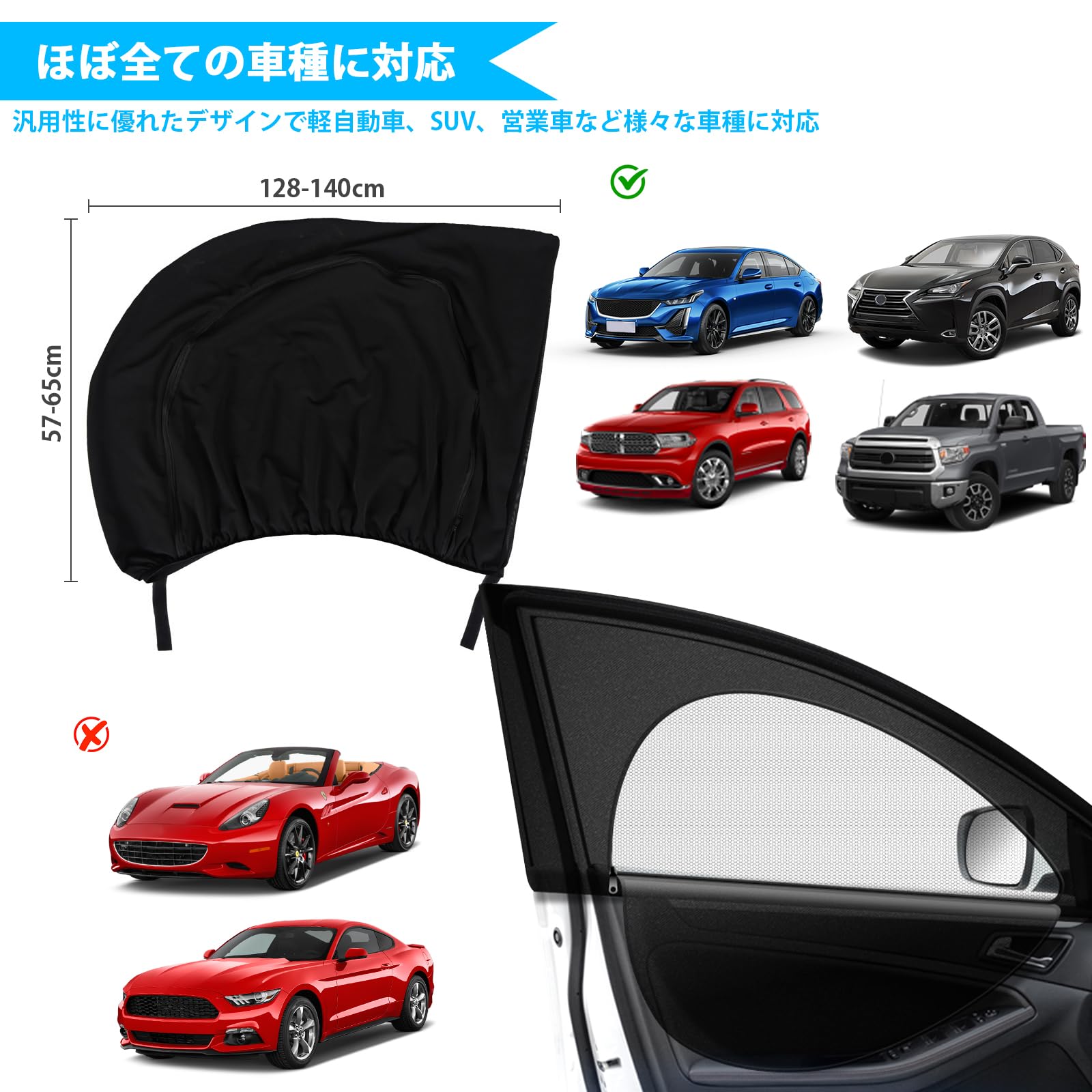 【多くの自動車と SUVに対応】フロントドア用網戸のサイズ:長さ約128-140cm、高さ約57-65cm。リアドア用網戸のサイズ:長さ約126-140cm、高さ約64-75cm。弾性材質の原因は、多くの自動車の車窓に適しています。汎用性に優れたデザインで軽自動車、SUV、営業車など様々な車種に対応。例えば弧/矩形ウインドー小ドア、矩形ウインドーMPV、円弧/矩形ウインドー小型SUVなど。(サイズが合う車両全てに取付可能)