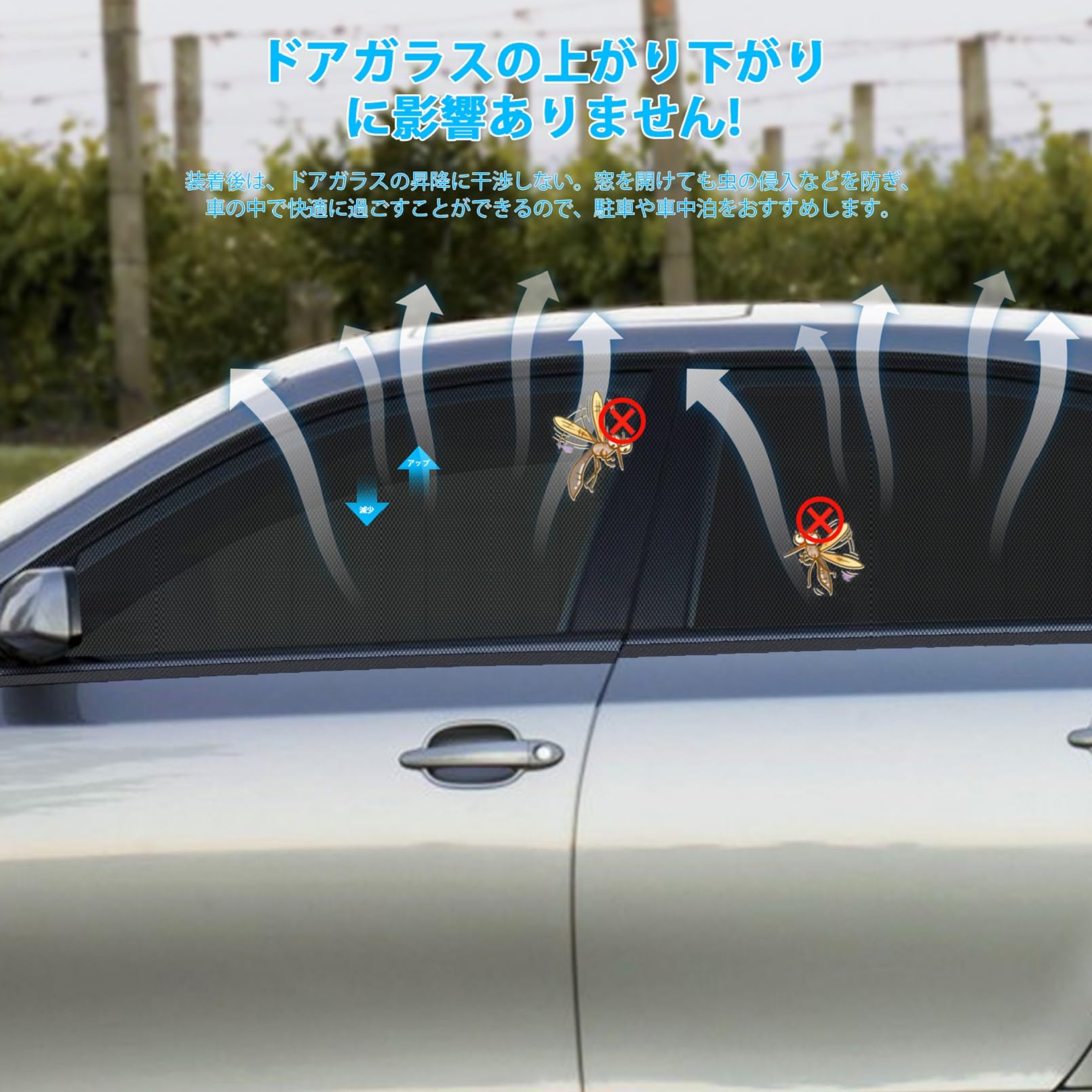 【通気性アップ、防虫対策】車用サンシェード(網戸タイプ)は、弾性細密メッシュ素材を採用して、通風と同時に効果的に防虫することができる。車用網戸を取り付けることで、ウィンドガラスの昇降に干渉しない!車中泊や駐車などでCO2排出削減、ガソリンの節約ために車用網戸は必要です。窓を自由に開けて自然からの風を感じることで、虫や蚊の侵入を防ぐことができます。