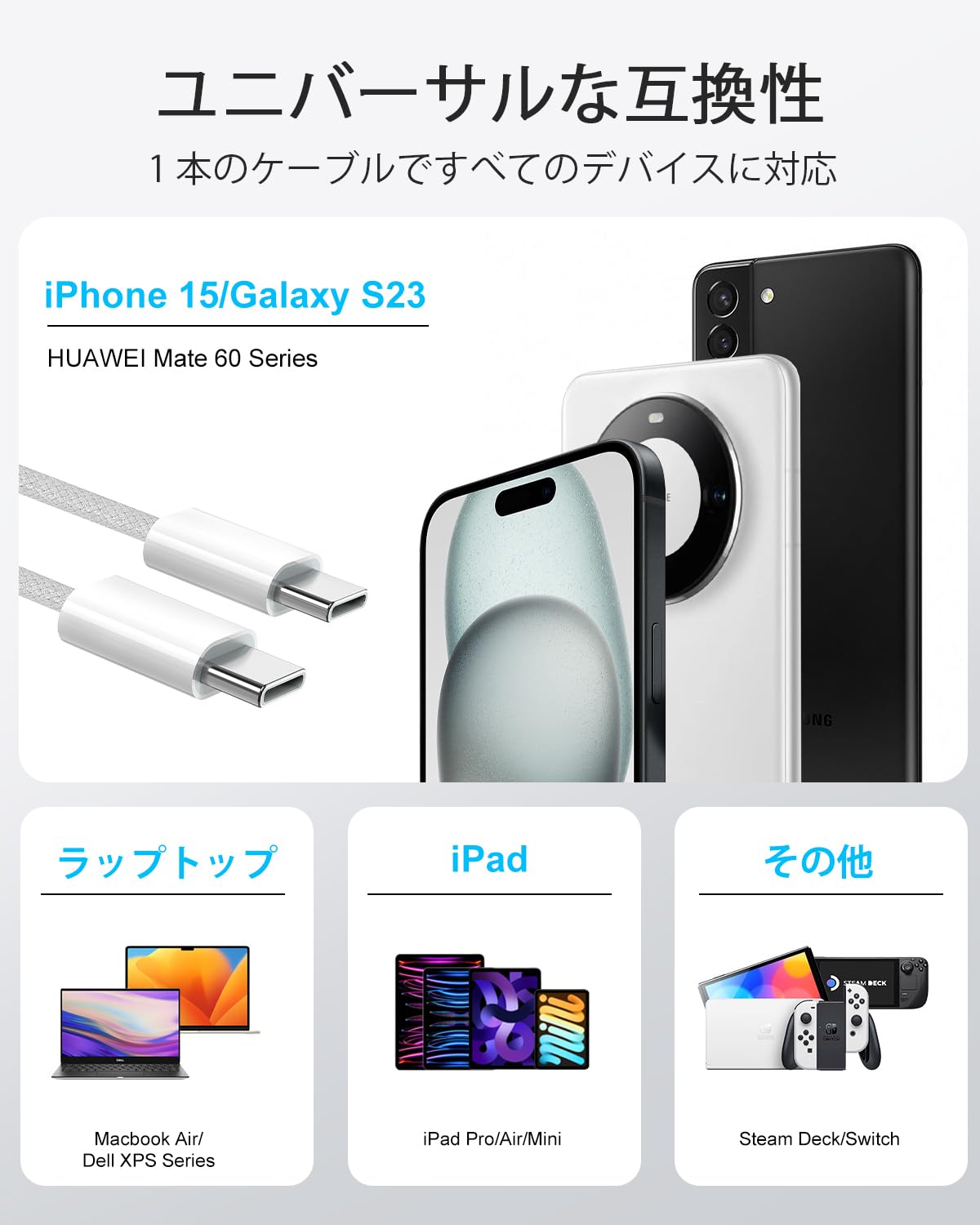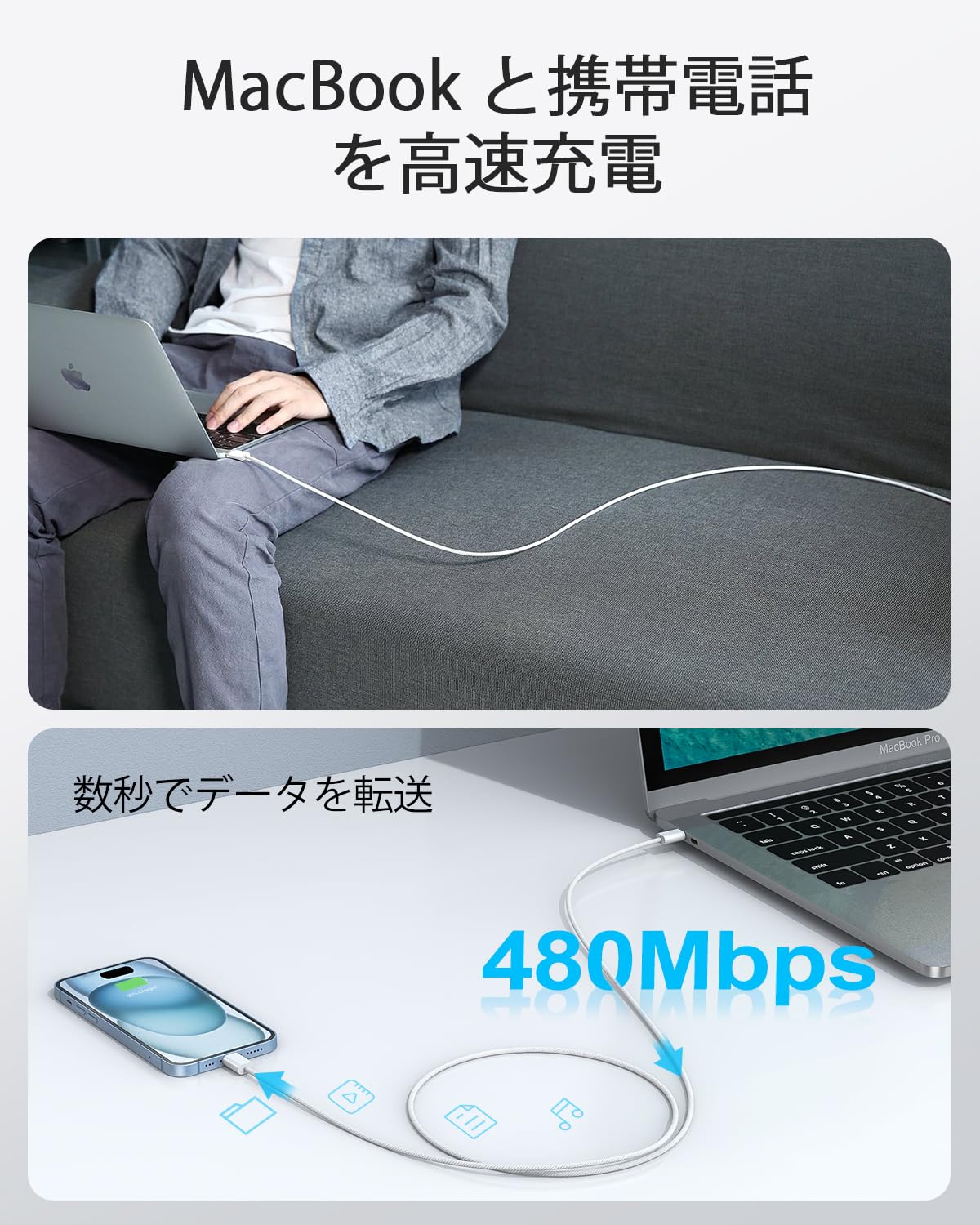 【android& iphone15 充電ケーブル】iPhone 15 充電ケーブル上質で触り心地の良い素材を使用し、さらに人間工学に基づいた製品デザインを施すことで,品質、快適性、信頼性の完璧なバランスを実現。PD急速充電も対応できて、知能チップを内蔵、デバイスの定格電圧と電流を自動べアバッテリーを保護します。