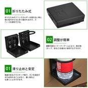 【コンパクトな折りたたみ設計】折りたたむと厚さ28mm、開くと100mmの省スペース設計。使わない時は邪魔にならず、車内の狭いスペースにも最適。調整可能なアームで、カップや缶をしっかり固定します。