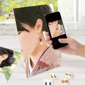 専用フォトスタンド付き.撮影しやすい角度にセッティング出来る。フォトスタンドの空いた部分にピアスを通すことが出来る。A4サイズが置けるスタンド。