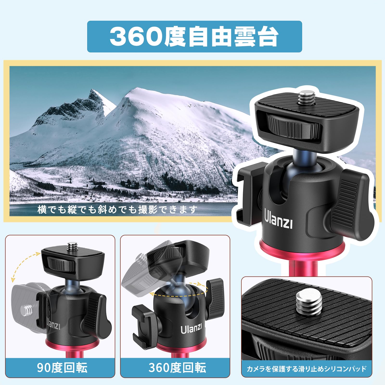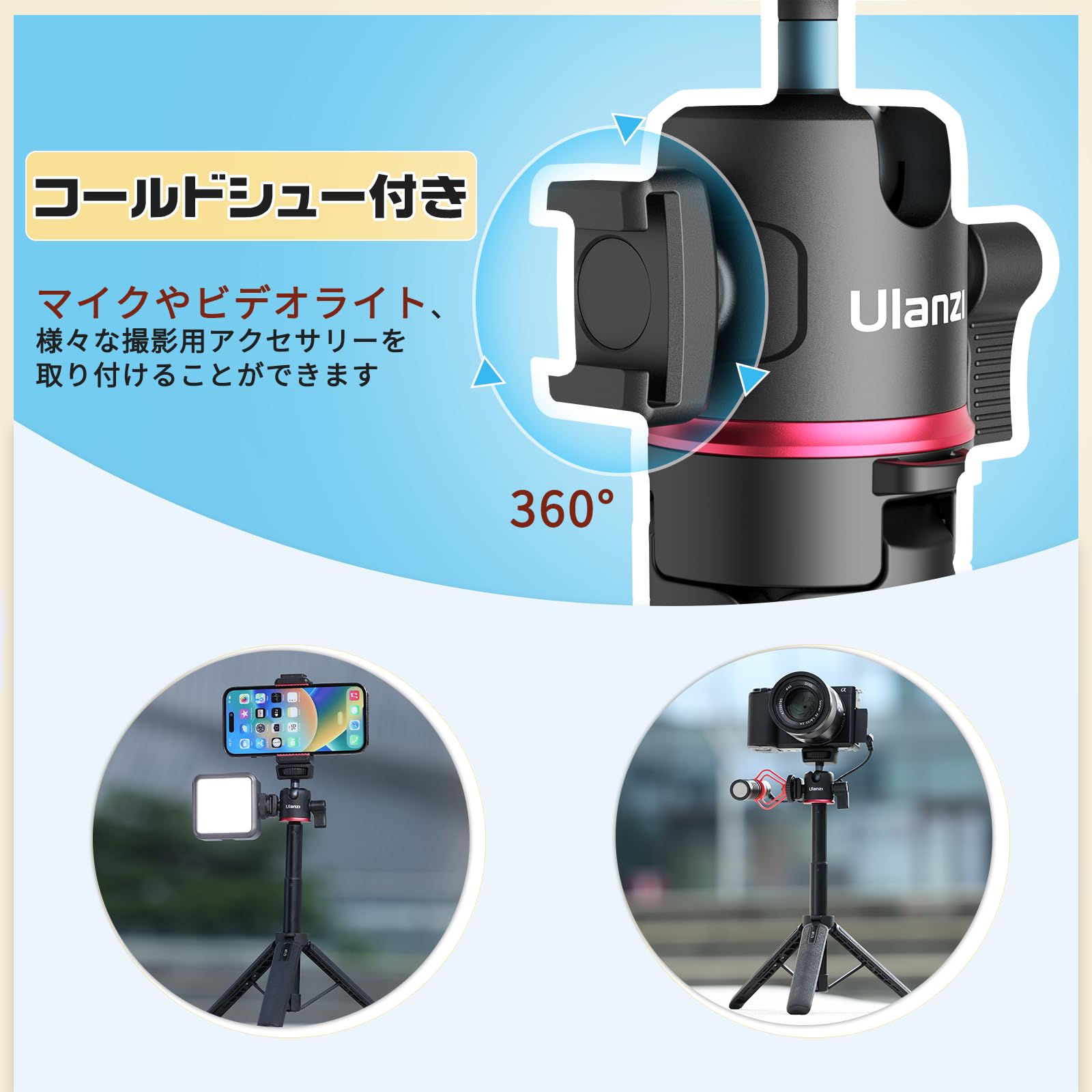 【360度コールドシュー搭載】コールドシューがあり、LEDライトやマイクなど動画撮影に様々な機材を装着できます。Ulanzi MT-73ミニ三脚は従来ミニ三脚モデルより、もっと長くなり、54cmまで伸びます。また、三脚の底部に頑丈な傘状構造を増加して、撮影の安定性をUPさせます。更に、落下や紛失防止のスラップを付属します。