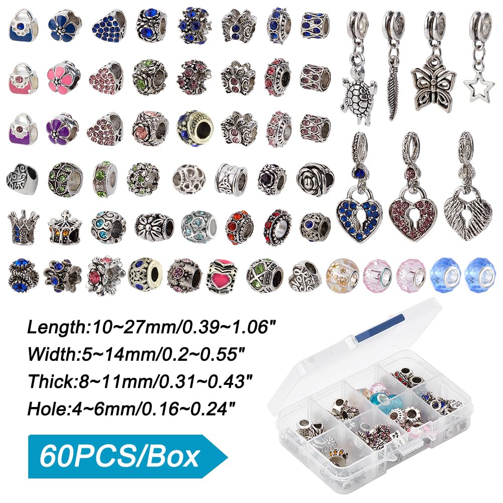 [PH PandaHall] 約60個セット ヨーロピアン スタイル ビーズ 大穴ビーズ 動物 チャーム ラインストーン ブレスレット ネックレス ジュエリー用 合金 混合色 10~27x5~14x8~11mm