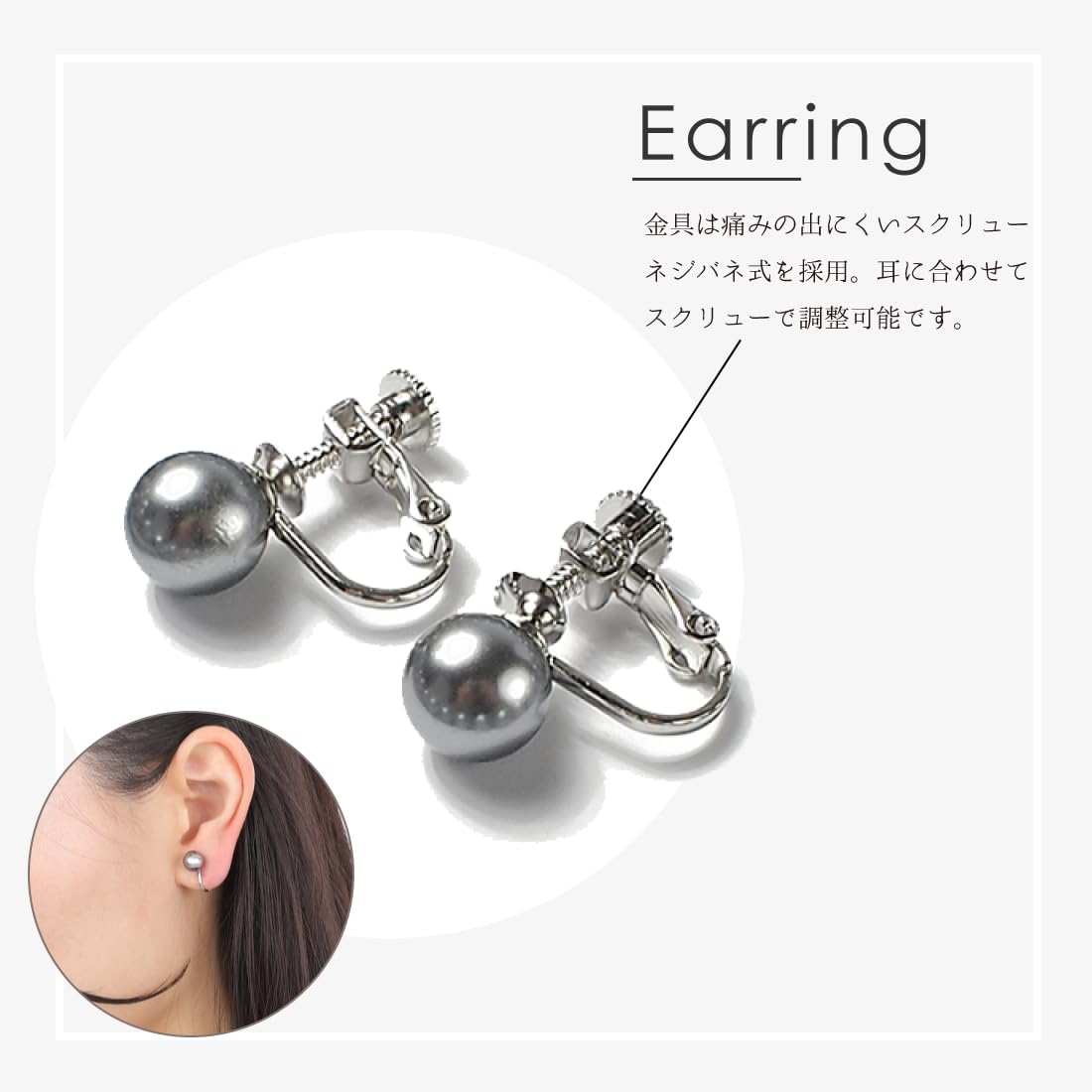 【サイズ】8mm珠パールネックレス:40~60cm、イヤリング:ネジバネ式金具タイプ・パール珠サイズ8mm 【素材】ガラスパール(人工真珠)、ネックレス留め具・イヤリング金具:真鍮(ロジウムメッキ)