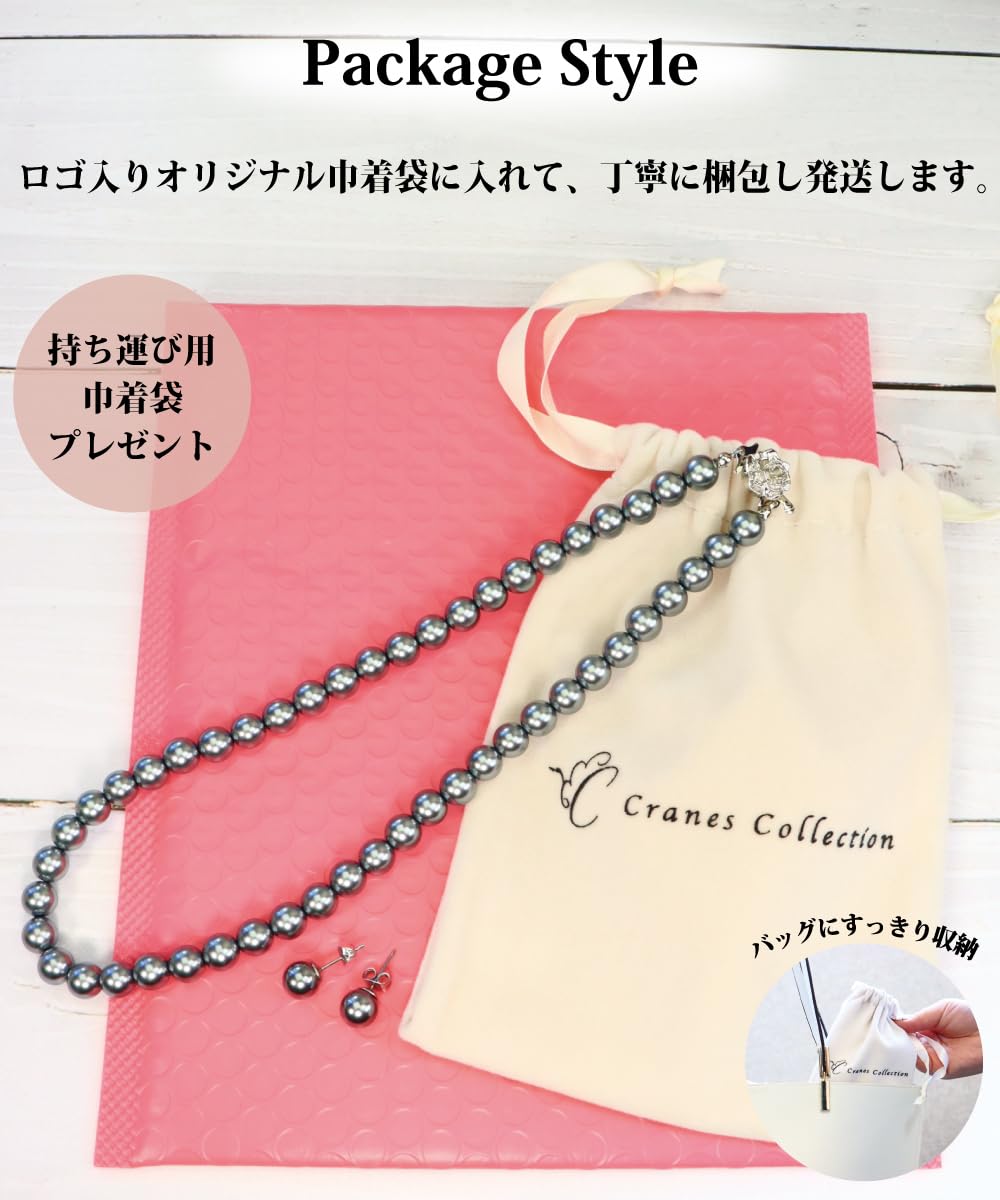 【特価商品】[CRANES COLLECTION] パール ネックレス ピアスイヤリング 2点 セット 日本製 グレー 国産真珠 自社生産 8mm珠 冠婚葬祭 巾着袋付 選べる6サイズ (シルバーブラックカラー) | ニコニコSHOP