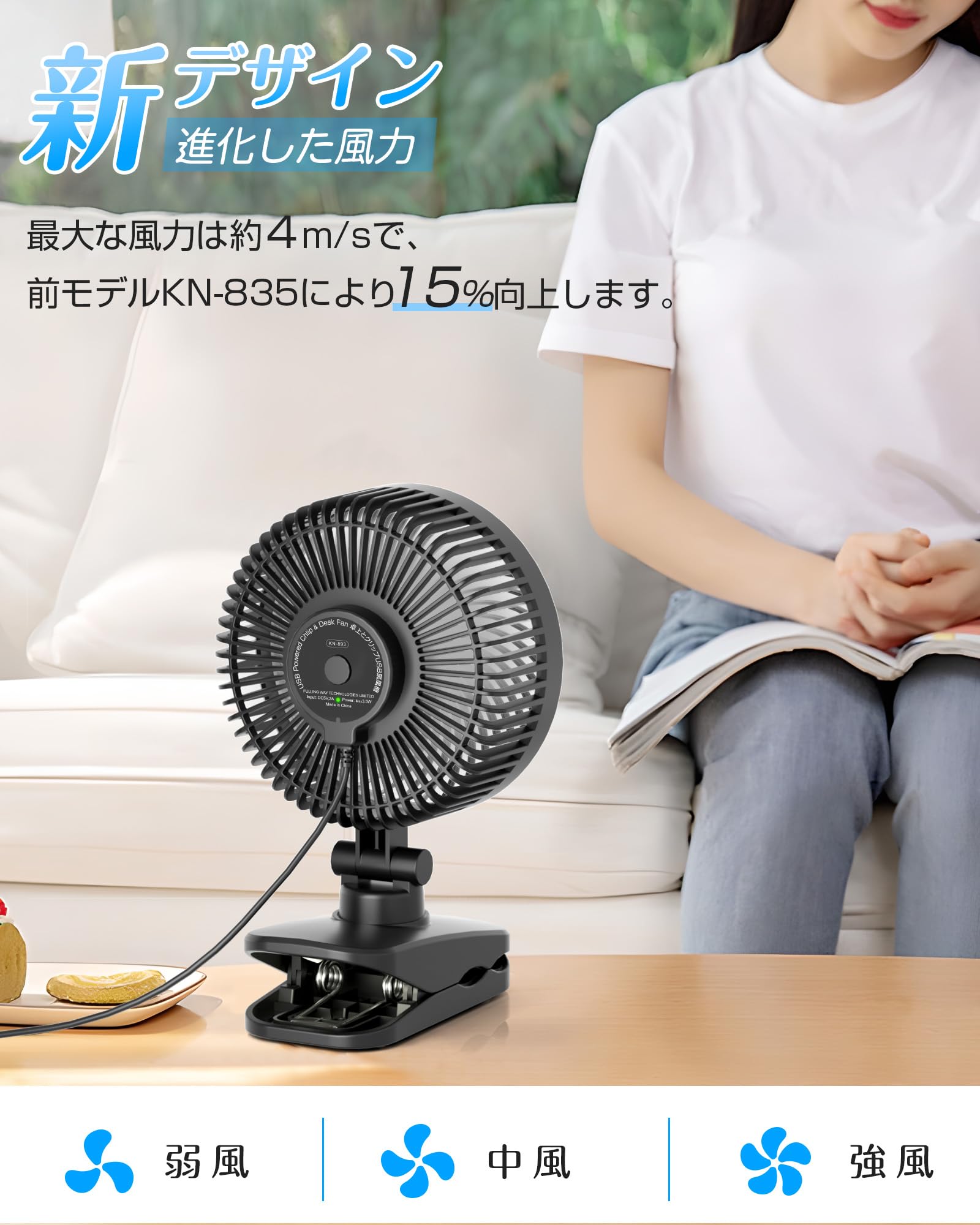 進化した2024モデル:コンパクトながら強力なパワーをもつ卓上扇風機で、従来のモデルKN-835に比べ風力を15%向上、風速も最大約4m/sとパワフルな涼しさを感じることができます。3段階の風量調節機能を備えており、お好みに合わせて調整することもできます。 *本製品の定格入力は5V/2Aです。5V/2A以上のアタプターなどで給電してください。