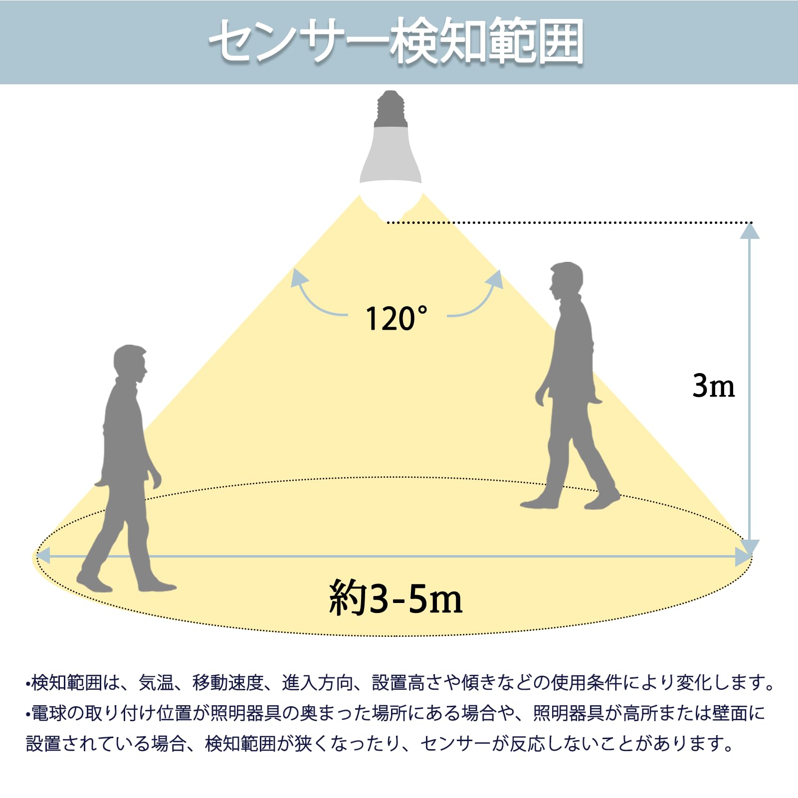 【人感センサーライト】検知範囲:直径約3-5m、検知角度:120°。人の動きを検知すると、自動で点灯します。動きを検知しないと、約60秒後自動で消灯します。(動きを検知し続けると、点灯時間が延長します。)便利に操作でき、無駄な電力を消費しません。