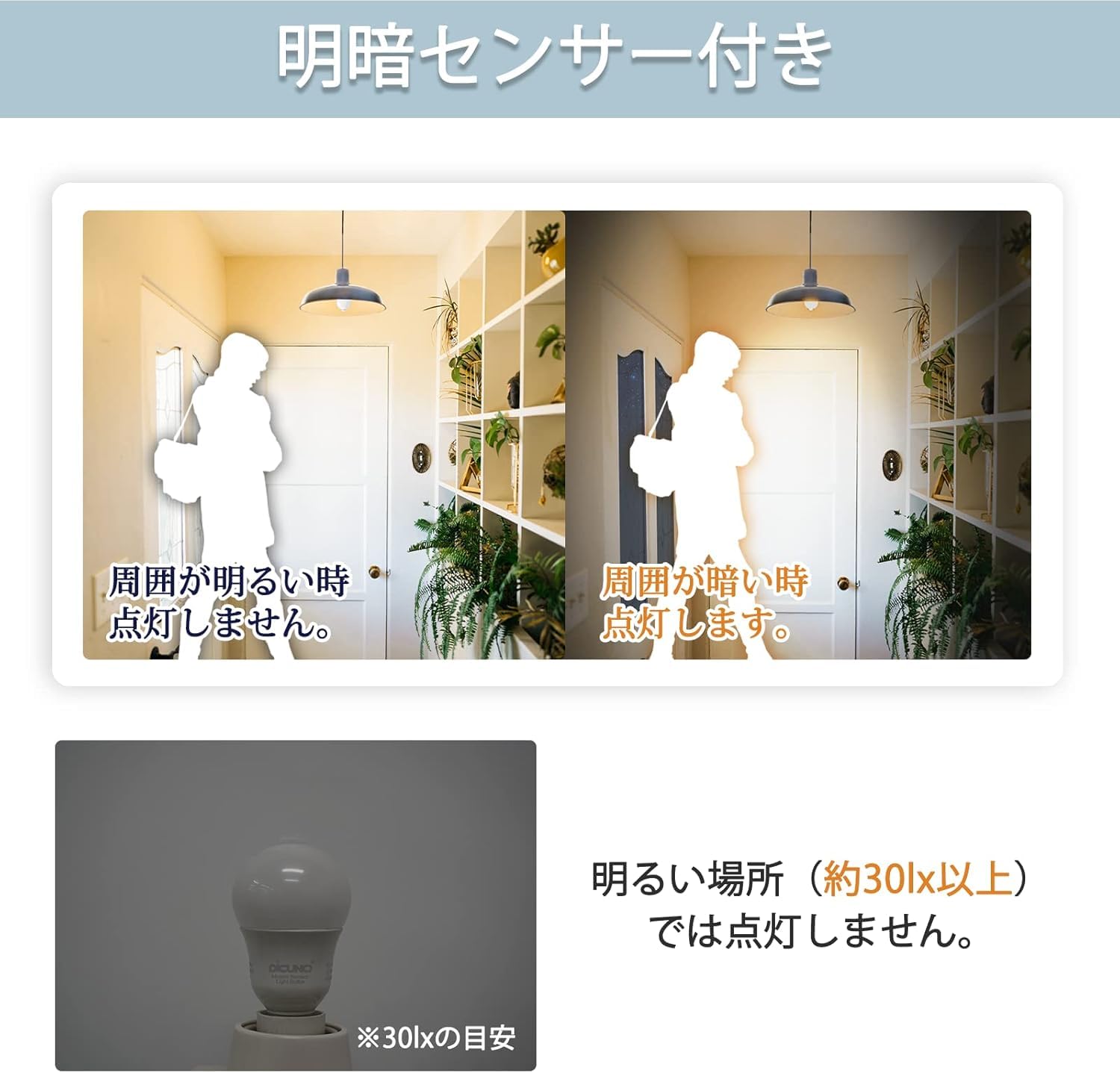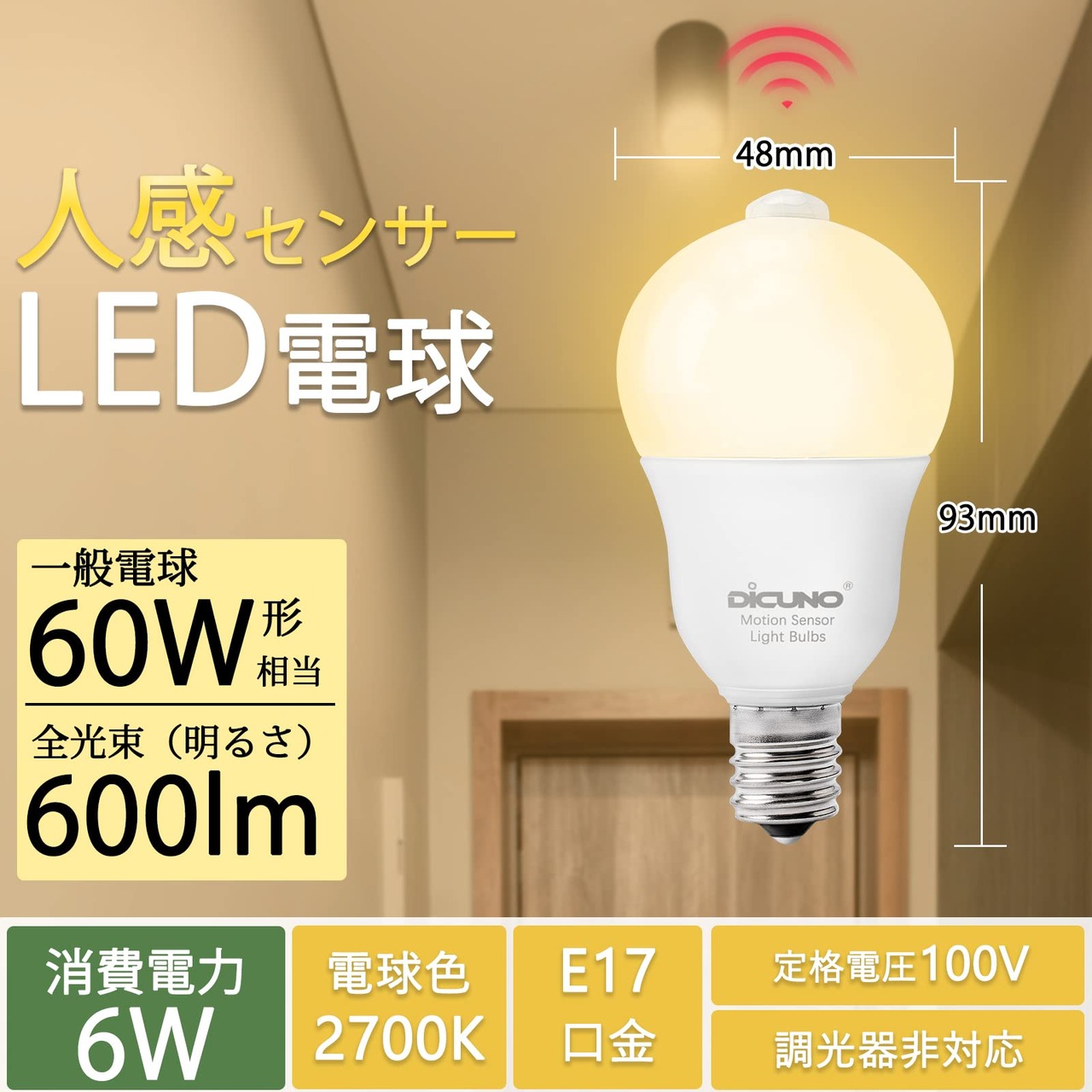 DiCUNO E17口金 LED電球 人感センサー 60形相当 電球色 6W 600lm 2700K 明暗センサー付き 赤外線センサ 消し忘れ防止 自動点灯 高輝度 AC100V 非調光 省エネ PSE認証済み 2個入