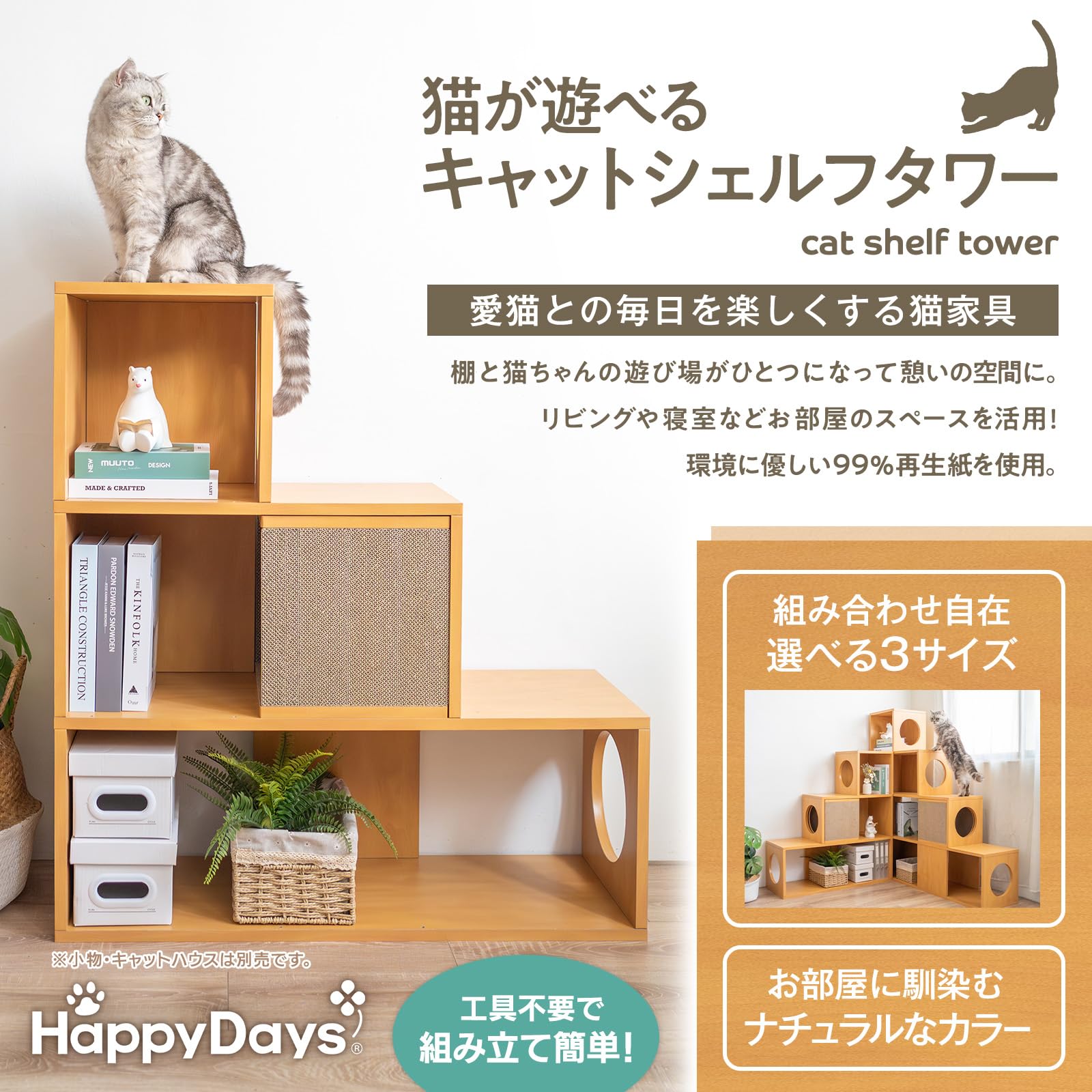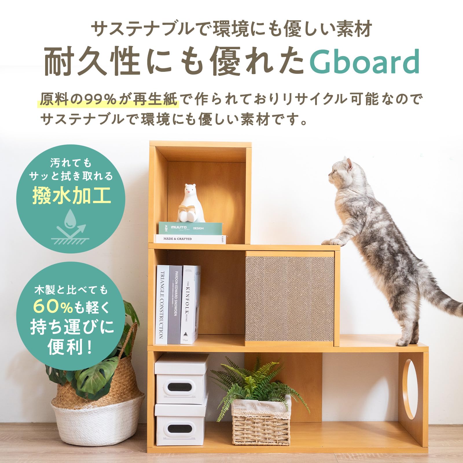 GBoardと呼ばれるフラットで耐久性に優れた、強力な紙パネルを使用して作られた猫用階段です。 ・猫ちゃんのステップやキャットタワーとしてはもちろん、本や雑貨を飾る棚としても使用可能 ・クギを使わず木製ビスと両面テープを使用しているので組み立て簡単 ・棚の向きはお部屋のレイアウトに合わせて組立可能 ・表面は撥水加工がしてあるのでお手入れ簡単 ・ホルムアルデヒド低減の最高基準 F認定を取得(認証機関:SGS、認定年:2023年) ・別売のHappy Daysキャットハウスと組み合わせてご使用いただけます
