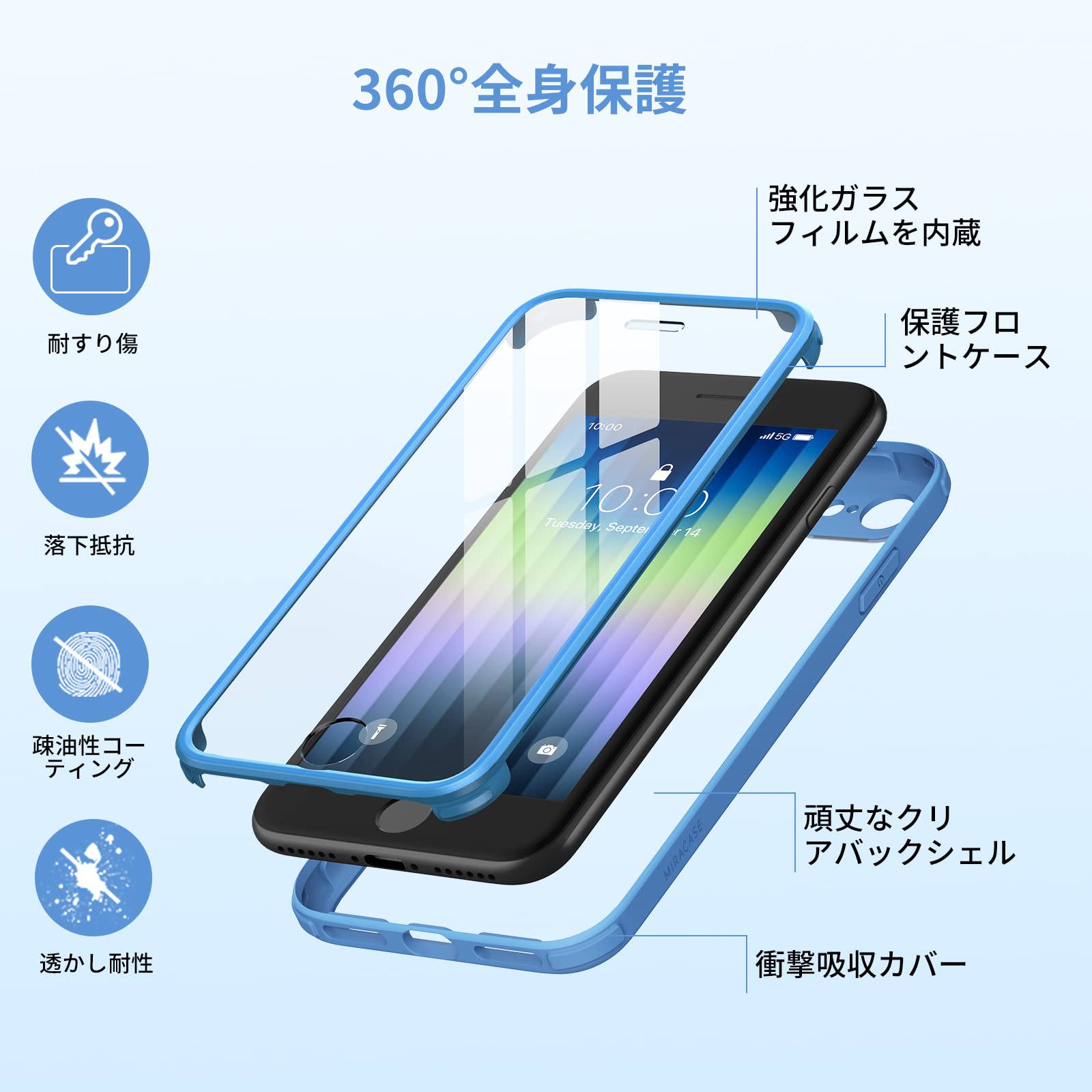 Miracase iPhone SE 用 ケース SE3 SE2 iPhone 8用スマホケース 第2世代 第3世代 4.7インチ 9H強化両面ガラス フルカバー ワイヤレス充電対応 (カプリブルー)