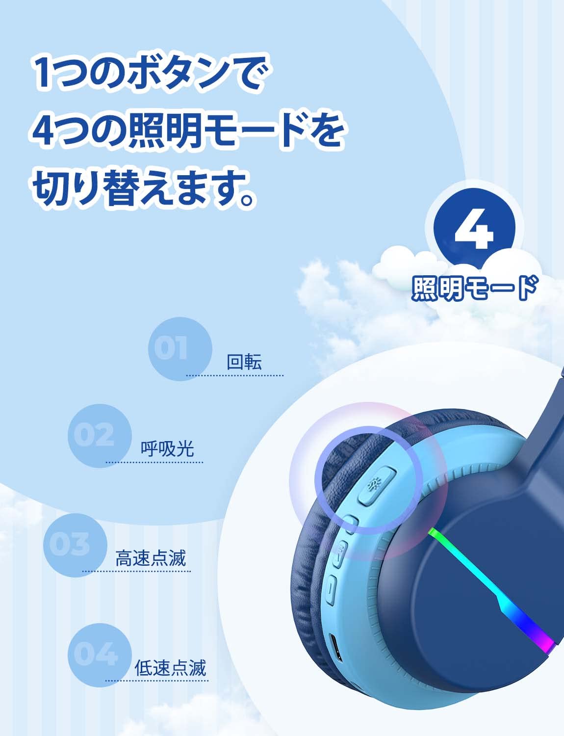 [ステレオサウンドと74/85dBAの音量制限]:豊かな低音とリアルなオーディオを提供する40mmスピーカーユニットを内蔵しています。接続可能距離は半径10メートル以内です。最大音量を85dBAに設定しており、機器の誤操作による大音量からお子様の耳を守る、お子様に優しいヘッドホンです。▲2025年2月~現在販売中のモデルは、WHOの更新に伴い、音量制限機能を「2段階(74/85dB)」に変更しています。