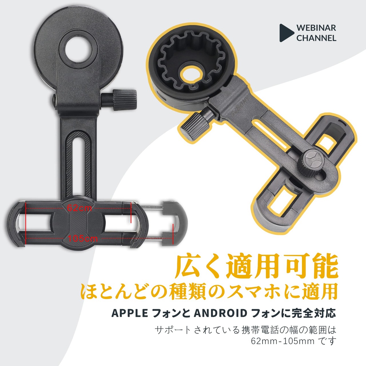 SV218 携帯電話マウントアダプタホルダーは、市場に出回っているほとんどの携帯電話、Apple および Android 携帯電話と完全に互換性があります。 サポートされている携帯電話の幅の範囲は62mm-105mmです。