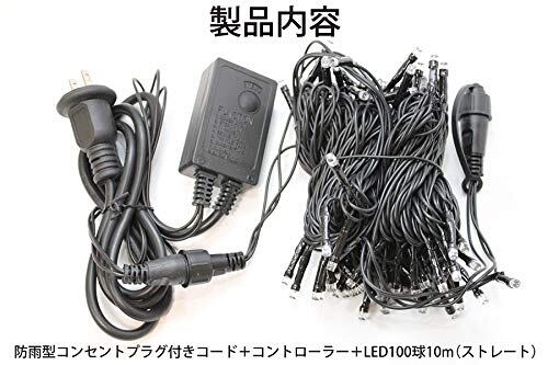 商品名:屋外用LEDイルミネーション ストレート 10m 100球 防水 防雨型 電球色(ゴールド)/ 型番:ILS100-G / LED球数:100球(高輝度拡散加工) / 重さ:約600g / 防水等級:IP44(防雨型プラグ採用) ※最長10セットまで連結可能。