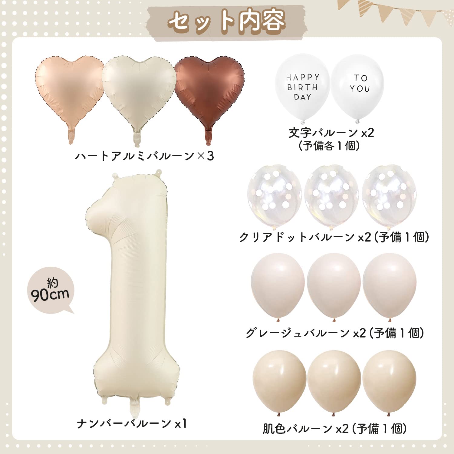 【飾りセット内容】①ナンバー1アルミバルーン×1個 ②ハートアルミバルーン×3個(クリーム色,肌色,チョコレート色) ③「HAPPY BIRTHDAY To You」文字バルーン×各2個 ④グレージュバルーン×3個 ⑤肌色バルーン×3個 ⑥クリアドットバルーン×3個