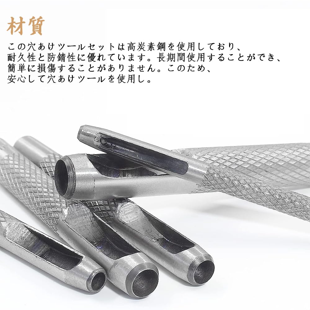 サイズ:直径サイズ(約)は2.5mm、3mm、4mm、5mm、6mm、7mm、8mm、9mm、10mmの9種類ポンチセットで。さまざまな穴あけニーズに対応できます。時計、財布、布地、紙、ベルトなど、さまざまな素材に対応したサイズがあり、異なるプロジェクトに簡単に対応できます。