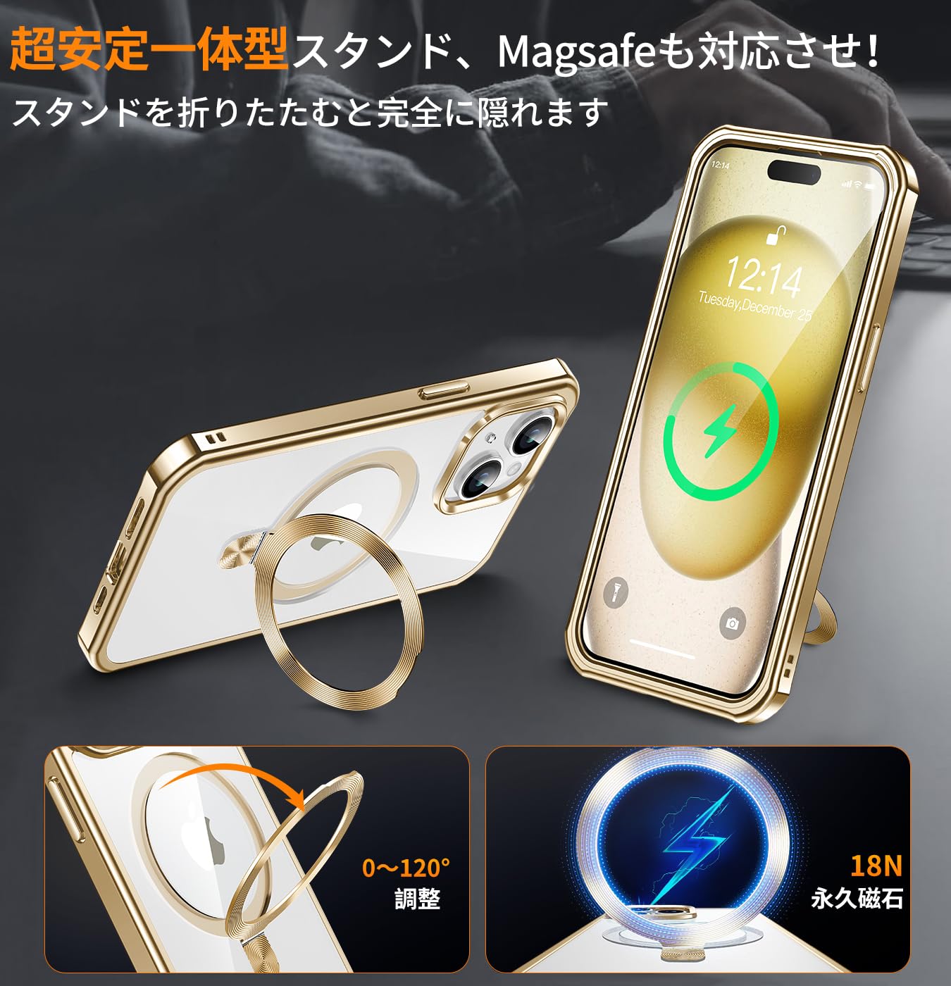 【360°全面保護・スタンド・Magsafe対応】KELLCASE iPhone 15 用 ケース 両面 隠しスタンド・CDリング 横縦両立 ワイヤレス充電 いphone15 カバー 黄変防止透明PC背面 メッキバンパー 米軍MIL規格耐衝撃 マグセーフ対応 高感度タッチ ストラップホール付き アイフォン15 用 ケース 6.1インチ(ゴールド)