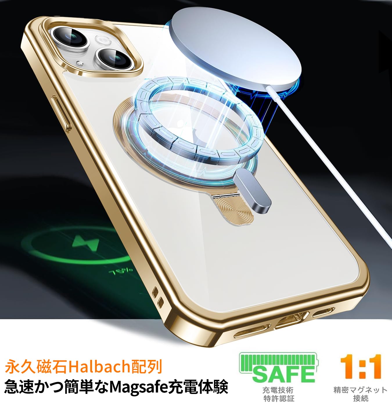 【在庫セール】【360°全面保護・スタンド・Magsafe対応】KELLCASE iPhone 15 用 ケース 両面 隠しスタンド・CDリング 横縦両立 ワイヤレス充電 いphone15 カバー 黄変防止透明PC背面 メッキバンパー 米軍MIL規格耐衝撃 マグセーフ対応 高感度タッチ ストラップホール付き アイフォン15 用 ケース 6.1インチ(ゴールド) | ニコニコSHOP