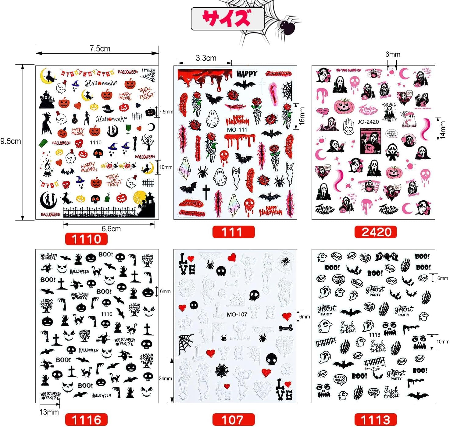 【豊かで多彩なパターン】夜光×2枚、3D×2枚、マット×2枚、合計6枚入り。ハロウィンネイルアートのニーズを一度に満たすことができます。ネイルシールの裏は粘性が強く、ピンセットで外して爪に貼り付けます。ご注意:破損防止のため,台紙から優しく丁寧にはがしてください