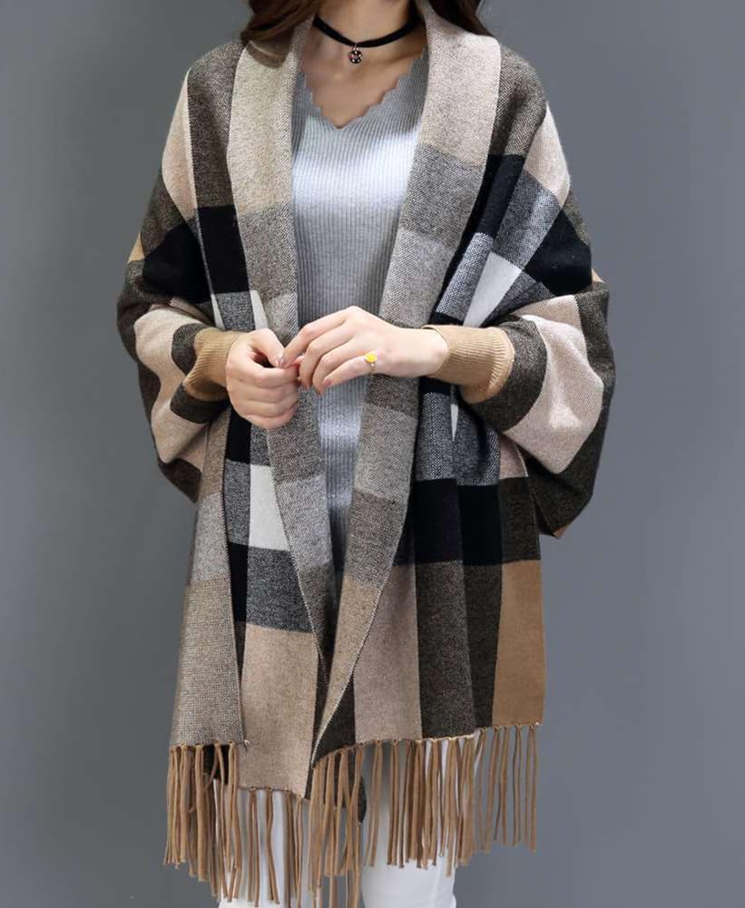 【お袖がついて、プチストレッチ解消!】こちらは袖付きなので、ズレ落ちることなく、アウター感覚でさっと羽織れて実用性◎