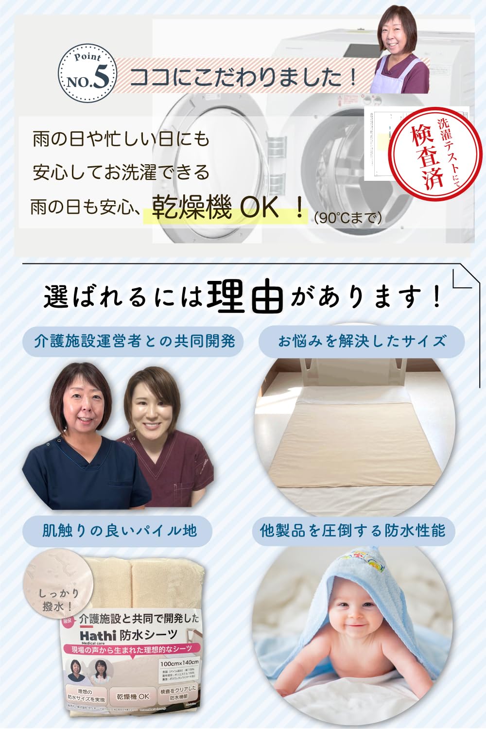 【折り込みやすい横幅&綿100%の柔らかいパイル地】 介護ベッドのサイズを考慮して140cm幅でつくりました。防水シーツは様々なサイズがありますが、 こちらのサイズは他のおねしょシーツや介護用防水シーツと比べて扱いやすいサイズに変更しました。 また、ラバーシーツや使い捨て 防水シートにはないパイル地の柔らかい肌触りにもこだわりました。