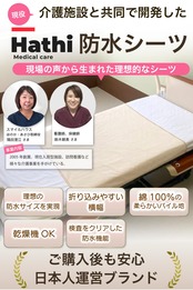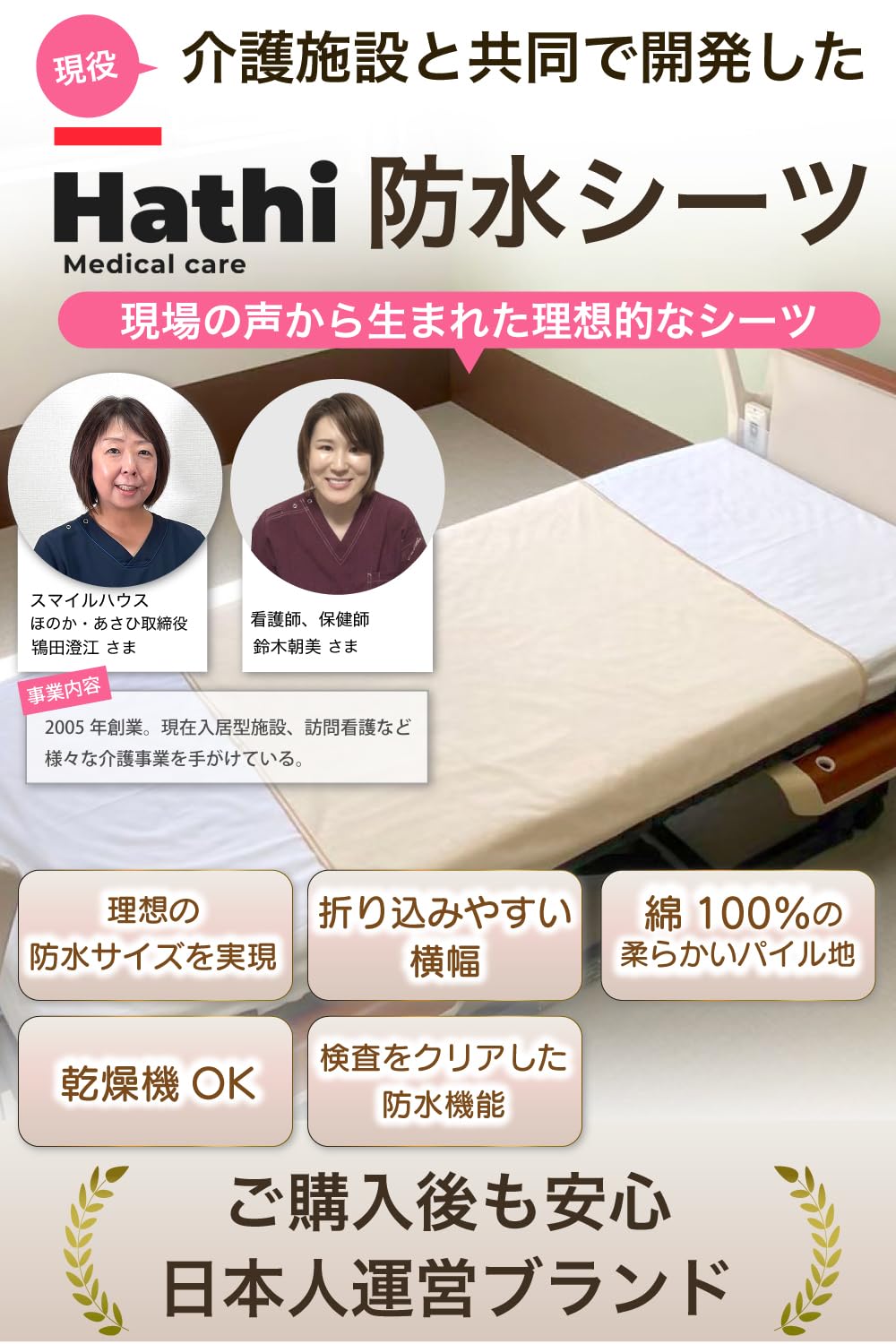 【理想の防水サイズを実現】 防水シーツを使用する際に、サイズが小さかったり大きすぎたりすることで負担が増えてしまうケース があります。Hathiの防水シーツは従来品と比べて使い勝手の良い100cmのサイズにすることで、 他の防水シーツ(シングル)やおねしょシーツと比べて扱いやすい介護用品をつくりました。
