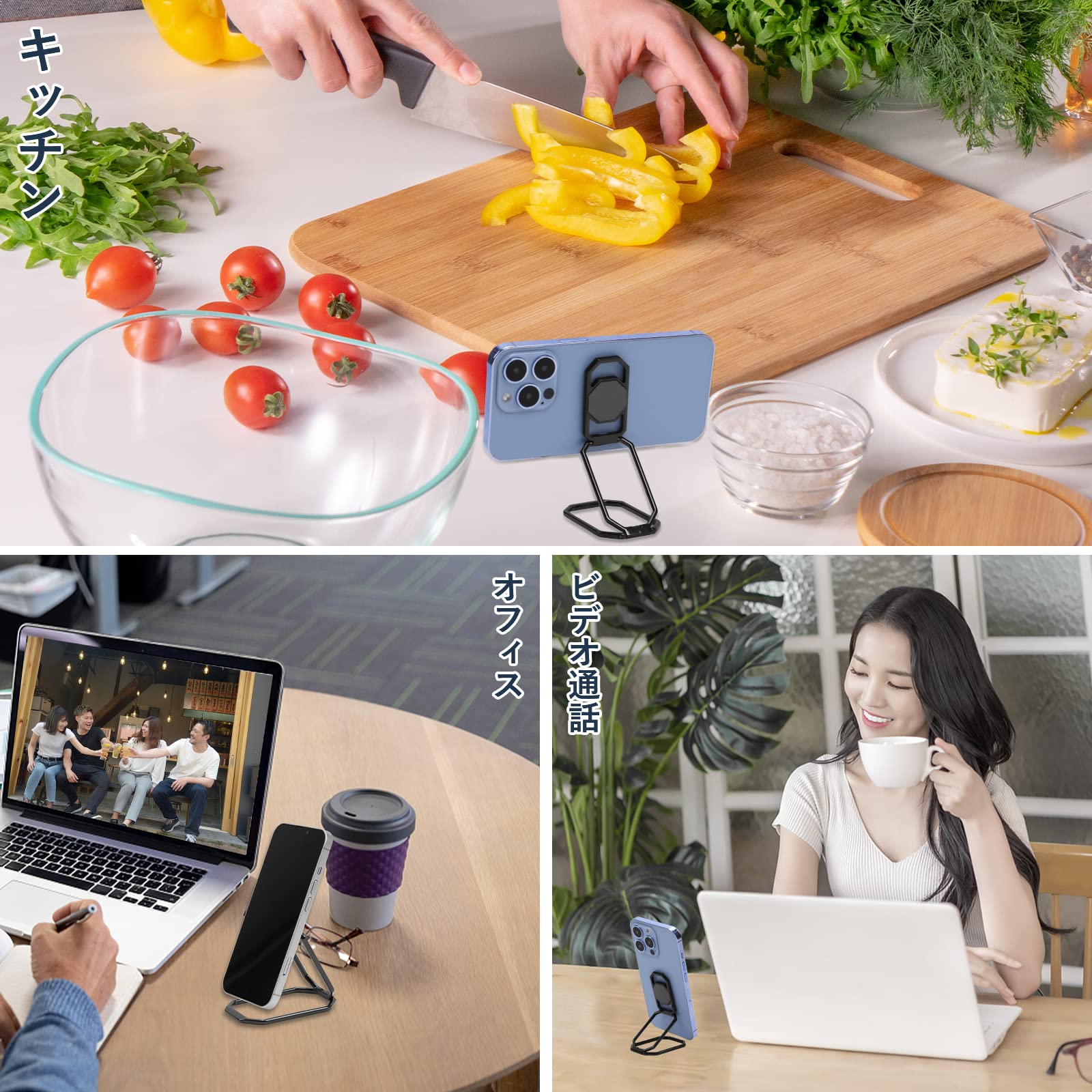 【3層構造と折りたたみの創造性】バンカーリング は3層デザインは無限の可能性を提供します。 想像力を駆使して、さまざまな折り畳み方法を見つけたり、机、キッチンキャビネット、ベッドサイドテーブルなど、さまざまな場面に最適な折り畳みを見つけたりできます。 このデスクトップフォンスタンドを自宅に置くと、料理をしながらレシピを見たり、テレビやLINEを見たりすることができます。(ホルダーを使用する際の安定性を高めるために、ステントはできるだけ三角形状にする)