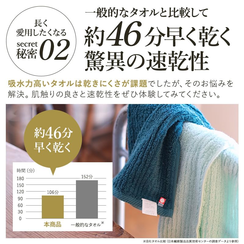 【パワフルな吸水力&速乾性】スーパーゼロの糸は、一つ一つの糸が持つ無数の隙間が水分を残さずしっかり吸い取ります。身体をさっと拭くだけで肌や髪の水分をしっかり吸収し、お風呂上がりをもっと快適に。また、タオルを”畔織”にすることで表面にでこぼこを生じさせて、肌触りの良さと速乾性を両立しました。これにより一般的なタオルよりも46分早く乾きます。