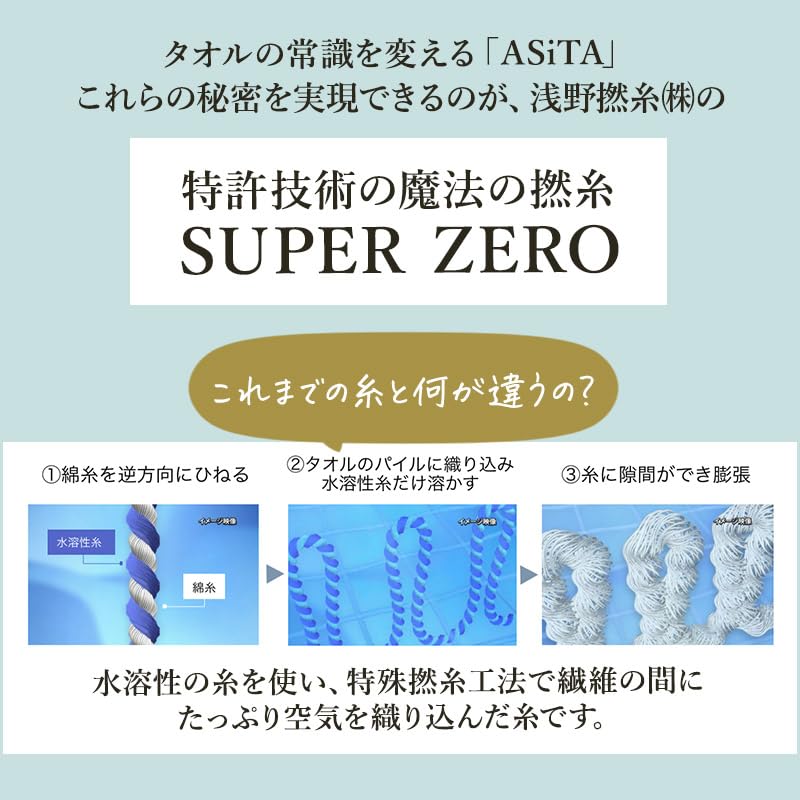 【世界初!特許技術の糸を使用したタオル】愛媛・今治で生まれた ASiTA(アシタ)のタオルは、空気をたっぷり含み、軽やかな使い心地。夏は涼やかに、冬は暖かな空気に包まれる極上タオル。「ふわふわの肌触りで毛羽落ちしない」を唯一両立できる魔法の糸「スーパーゼロ」を使用し、繊維の間にたっぷり空気を含む糸を使用することで、心地よい肌触りと毛羽落ちレスを実現しました。