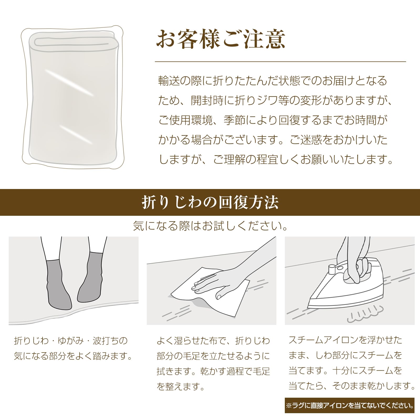 【滑り止め加工・ヘム加工】カーペットの裏面にはゴム製の滑り止め加工が施されており、フローリングの上でもズレにくいため、お子さまやご高齢の方がいるご家庭でも安心してお使いいただけます。 また、ラグの縁にはヘム加工を施しており、見た目が美しいだけでなく、丈夫でほつれにくく、長くご使用いただけます。