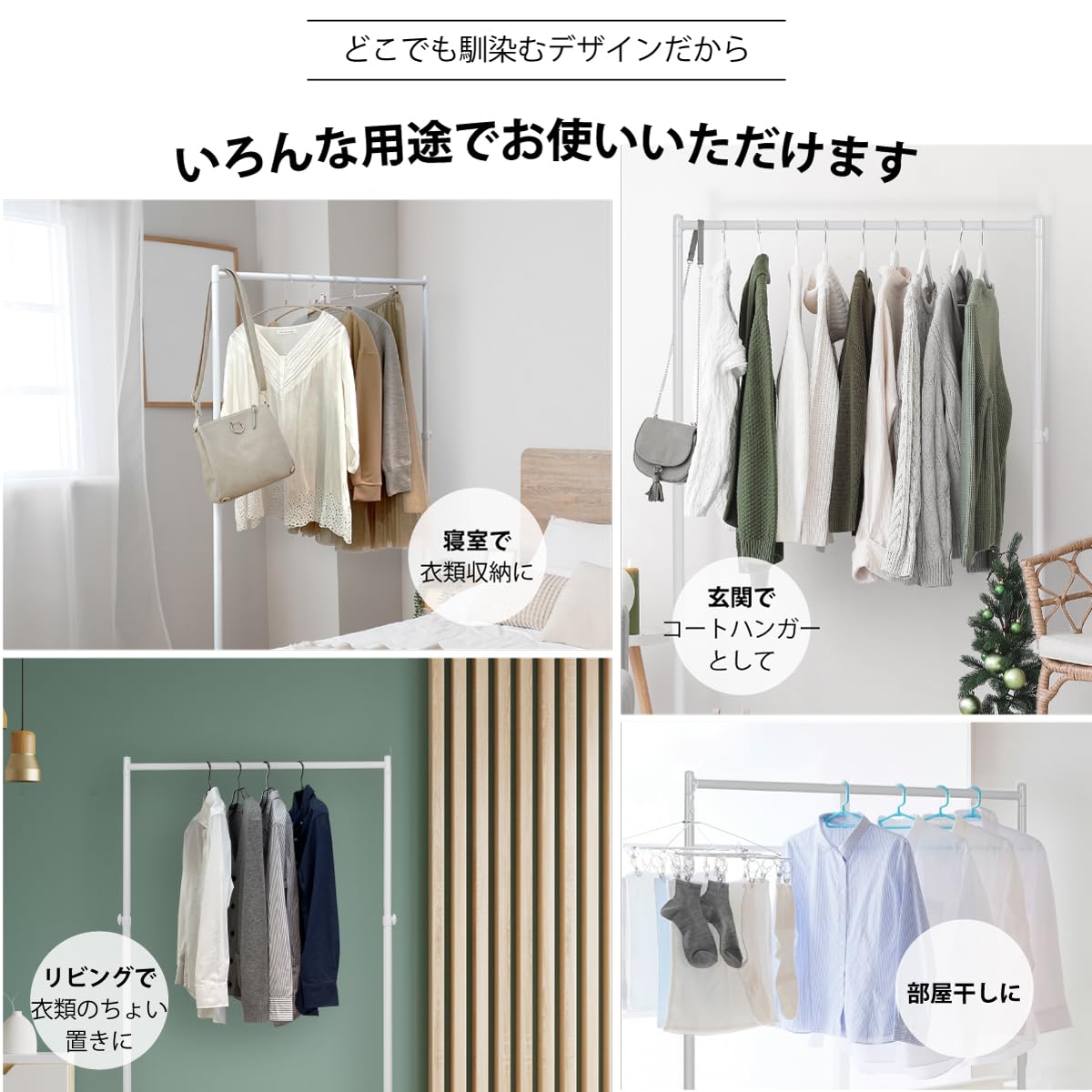【こんな使い方があります!】 自宅の寝室やリビング、クローゼットでの衣類収納はもちろんオフィスやカフェ、ショップのバックヤードにもぴったりです。コンパクトなサイズ感で場所を取らず、イベントや展示会での一時的な衣類収納にも活躍します。
