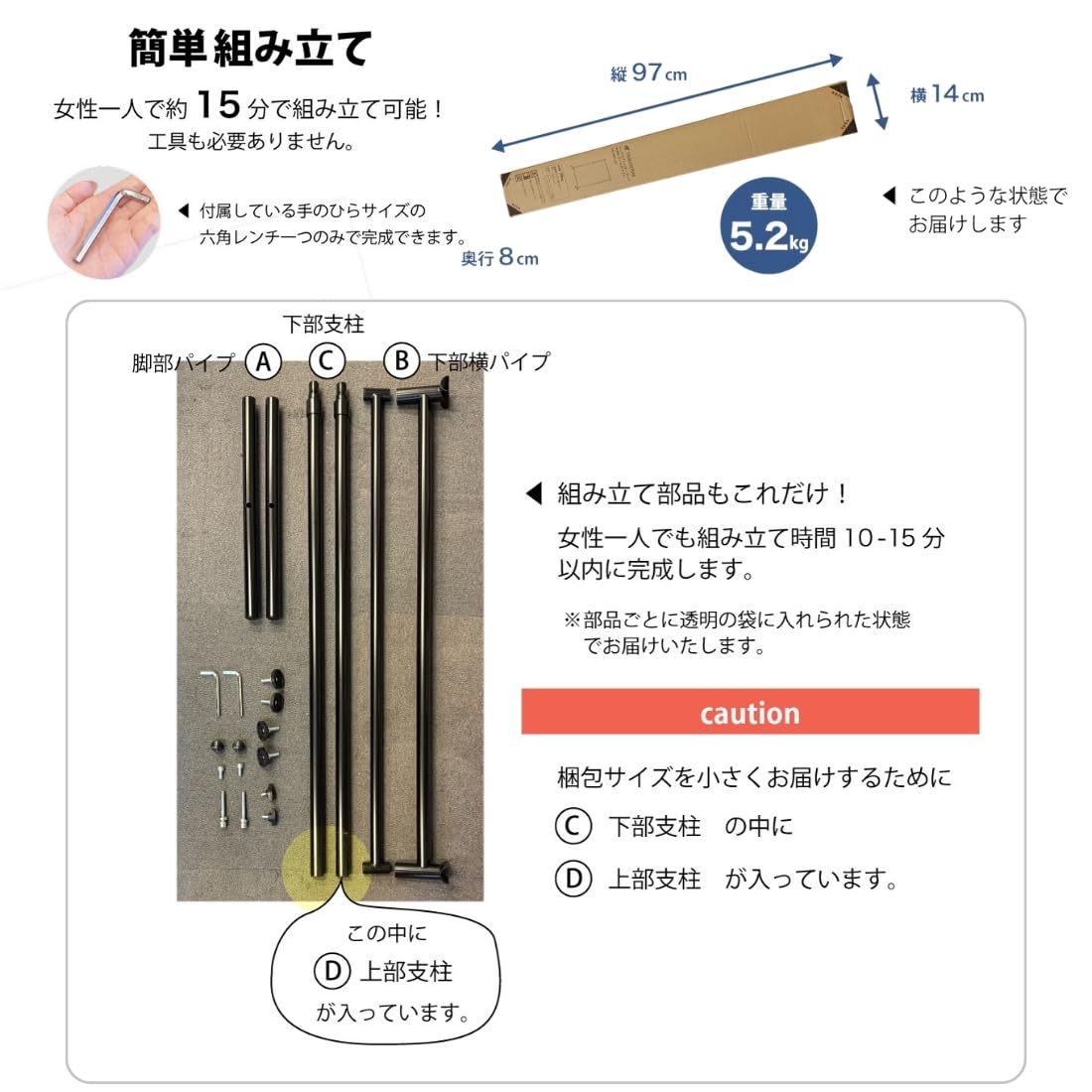 【不安なく使える設計】 初心者でも10~15分程度で組み立てられるハンガーラックです。工具の準備は必要なし!付属している手のひらサイズの六角レンチ1つのみで完成します! 安定感のあるスチール製フレームを採用し、耐荷重70kgまでしっかり支えるため、冬物コートやスーツなどの重い衣類も安心して掛けられます。また、足元にはエンドキャップが付いており、床への傷防止や滑り止めの効果があり、安全にお使いいただけます。