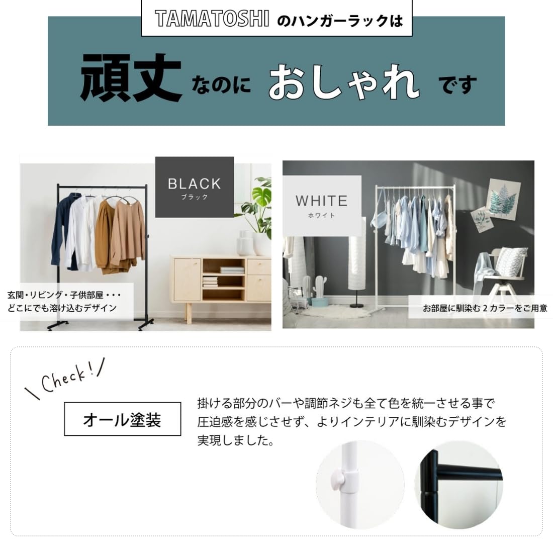 【オール塗装】インテリアに馴染むオール塗装ハンガーラック。掛ける部分のバーや調節ネジも全て色を統一させる事で圧迫感を感じさせず、よりインテリアに馴染むデザインを実現しました。