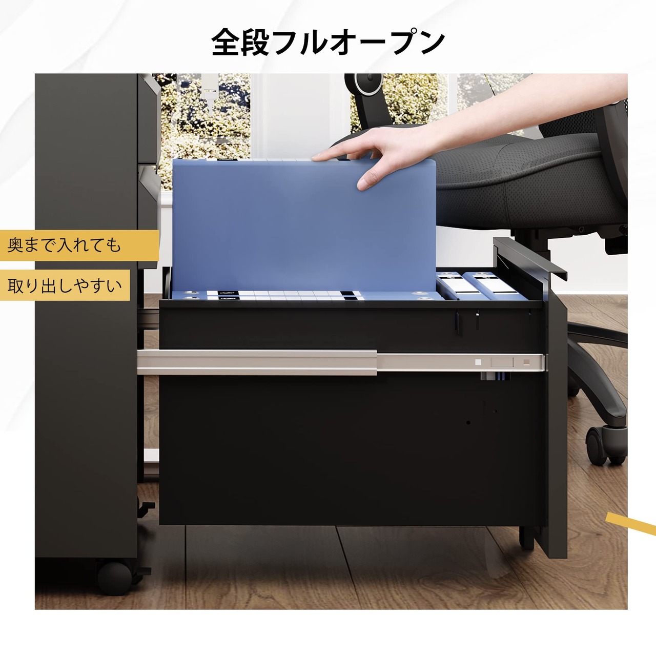 【引き出し3段フルオープン】引き出しが3段付き、用途で使い分けられるので細かいファイル整理が可能。1段目には、ペントレ付き、細かい文具も綺麗に収納できます。3段目は、A4ファイルがすっぼり納まります。着脱可能な仕切り板付きで、分類に役立ちます。効率よく整理できる同時に、充分な作業スペースもします。