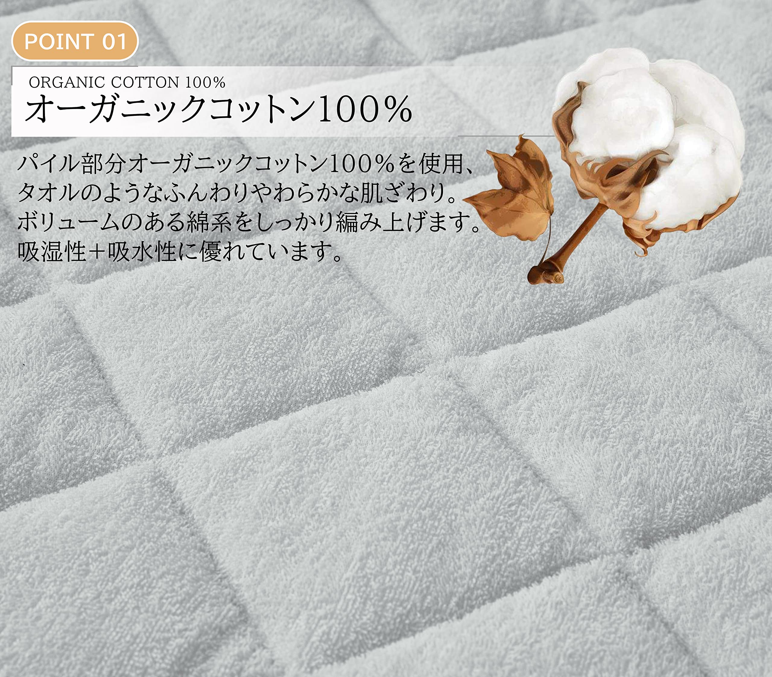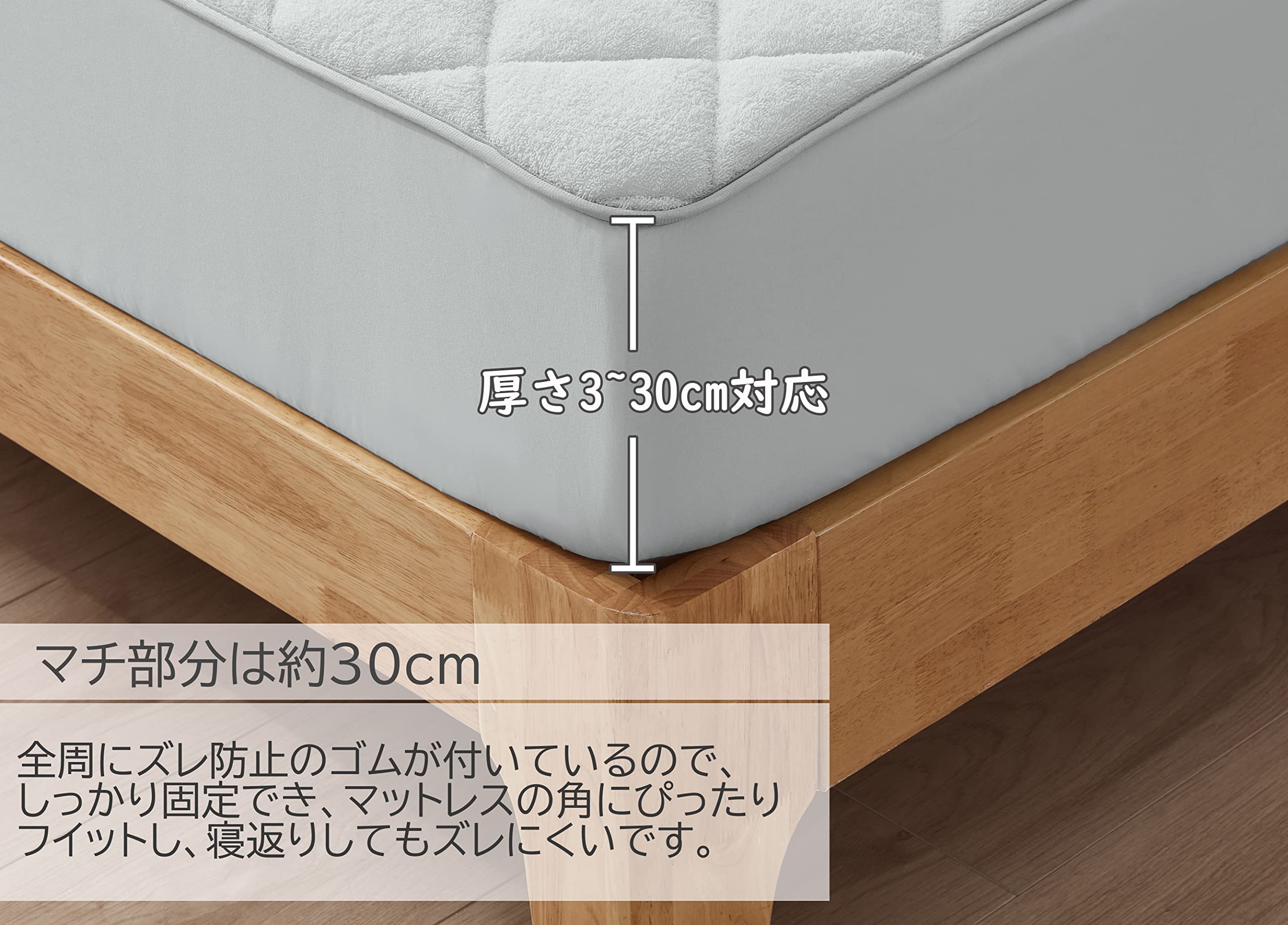 【ボックスシーツ+敷きパッド 一体型】:ほどよい厚みの中綿を入れ、ふんわり心地よい寝心地を実現しました。一体型なので敷パッドの取り付け用ゴムが表に出ることもなく見た目もキレイ!全周フィットゴム付きで取り付けも簡単です。ベッド用、マットレス用、敷ふとんなどにも使えます。