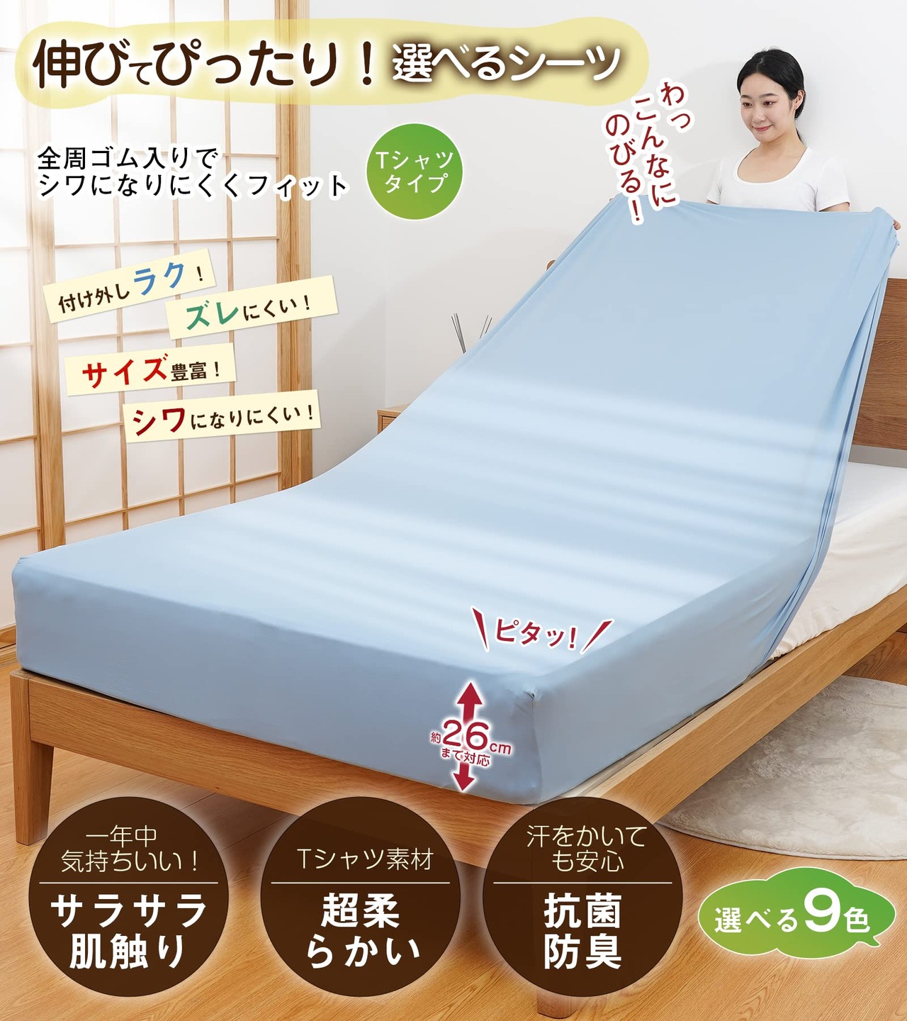 【超柔らかいTシャツ素材&オールシーズン快適】ボックスシーツの生地はまるでおTシャツのようで柔らかくなめらかな肌触りで心地よく、最初から肌になじむように仕上げました。肌への引っ掛かりを感じづらいので、肌あたりが気にならず心地よくお休みいただけます。暖かい季節( 春 夏 )も、寒い季節( 秋 冬 )も 12年を通して長い期間、快適にお使い頂けます。