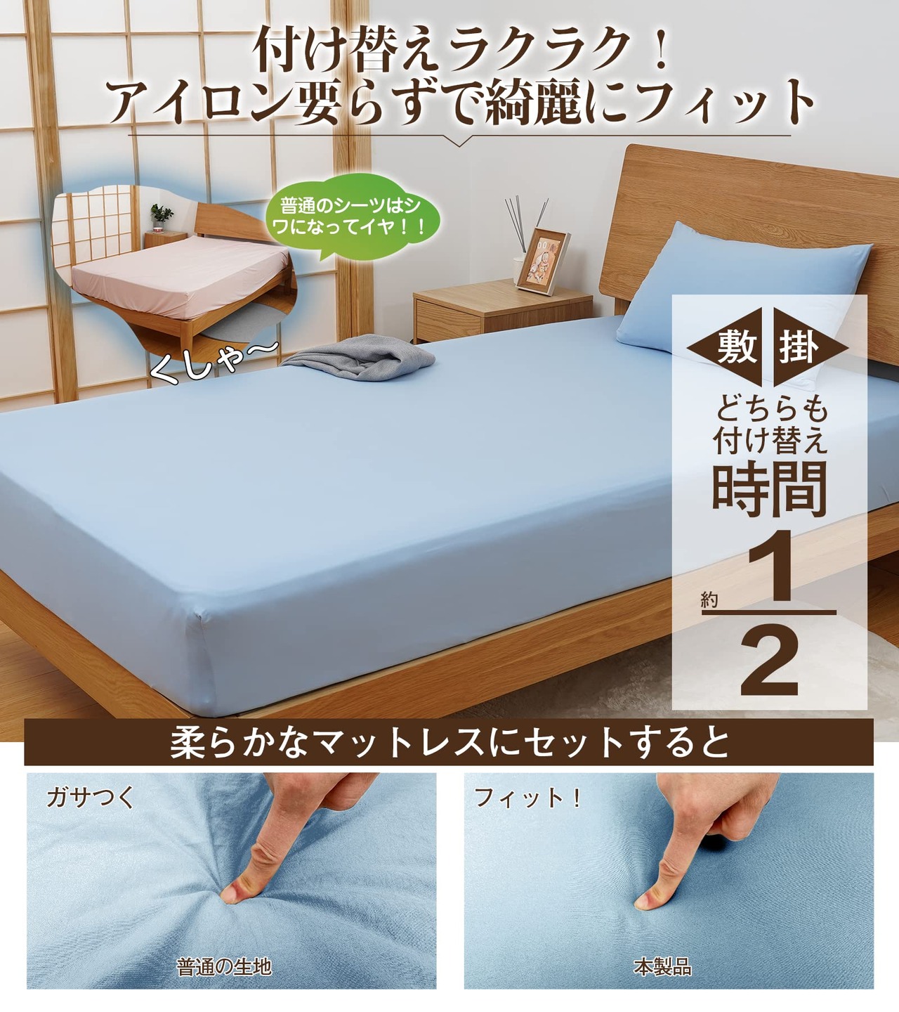 【3Dストレッチ生地&伸びるベッドシーツ&アイロン要らず】お客様のご要望にお応えできるように、仕上がりの美しい、綺麗にフィットするシーツを作りました。ポリウレタン混の生地なので伸縮性に優れタテにもヨコにも自由自在に伸びる素材だから手間をかけず簡単に装着できます。半端なサイズもキレイにフィット。シワになりにくいから気になる取り付け時のシワも アイロンいらずでキレイにフィット。面倒家事も短縮できます。