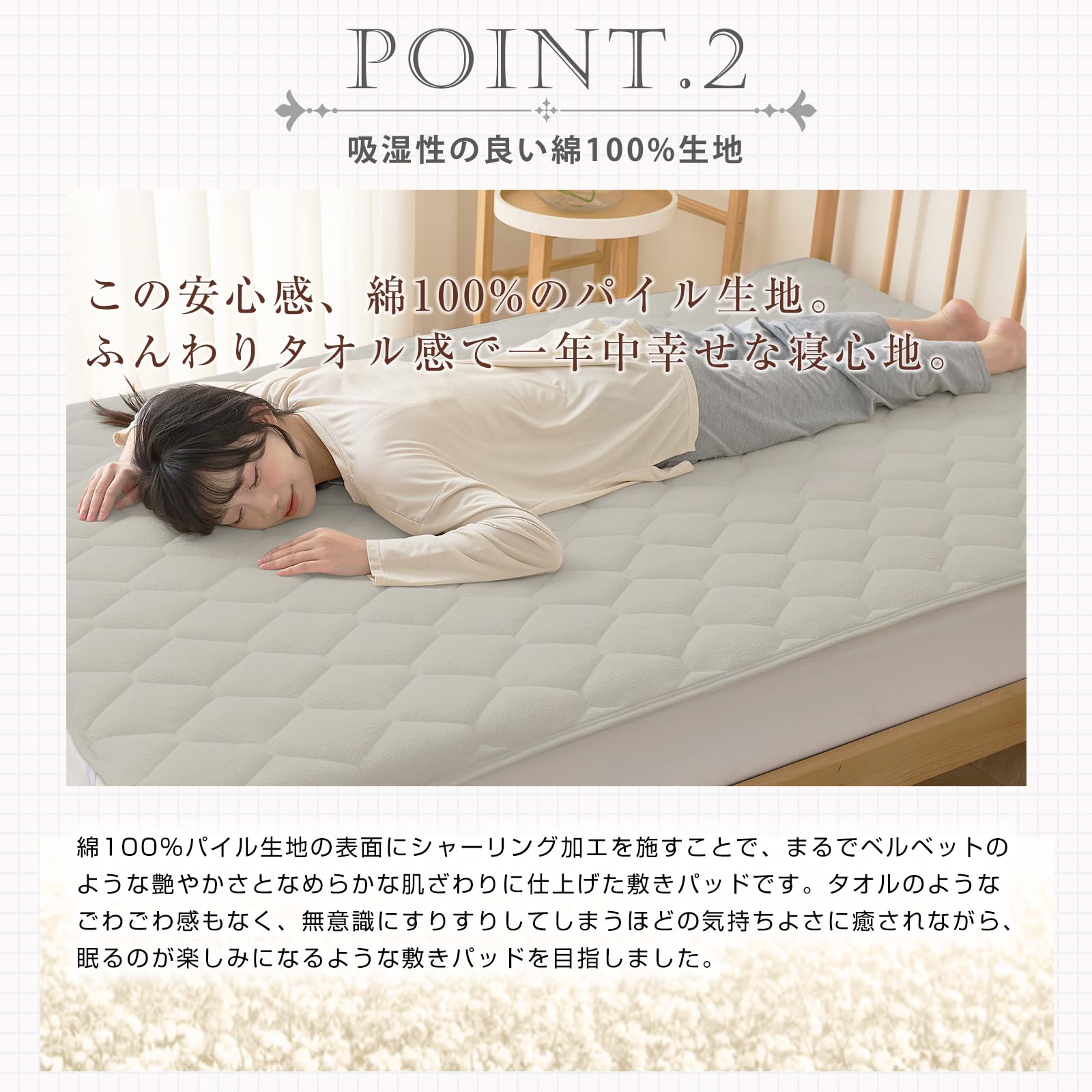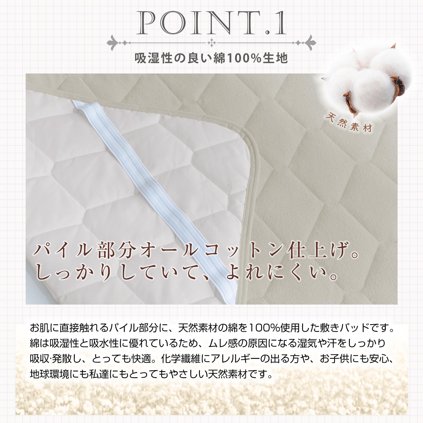 【ピシッと固定できるゴムバンド】4隅にゴムバンドをつけた敷パッドです。布団派の方も、ベッドマットレス派の方もお使いいただけます。シングルからファミリーサイズまでのサイズをご用意していますが、ロングサイズにも対応可能です。しっかりと固定できるので、シーツの脱着が簡単に行えます。寝返りを打っても大丈夫です。