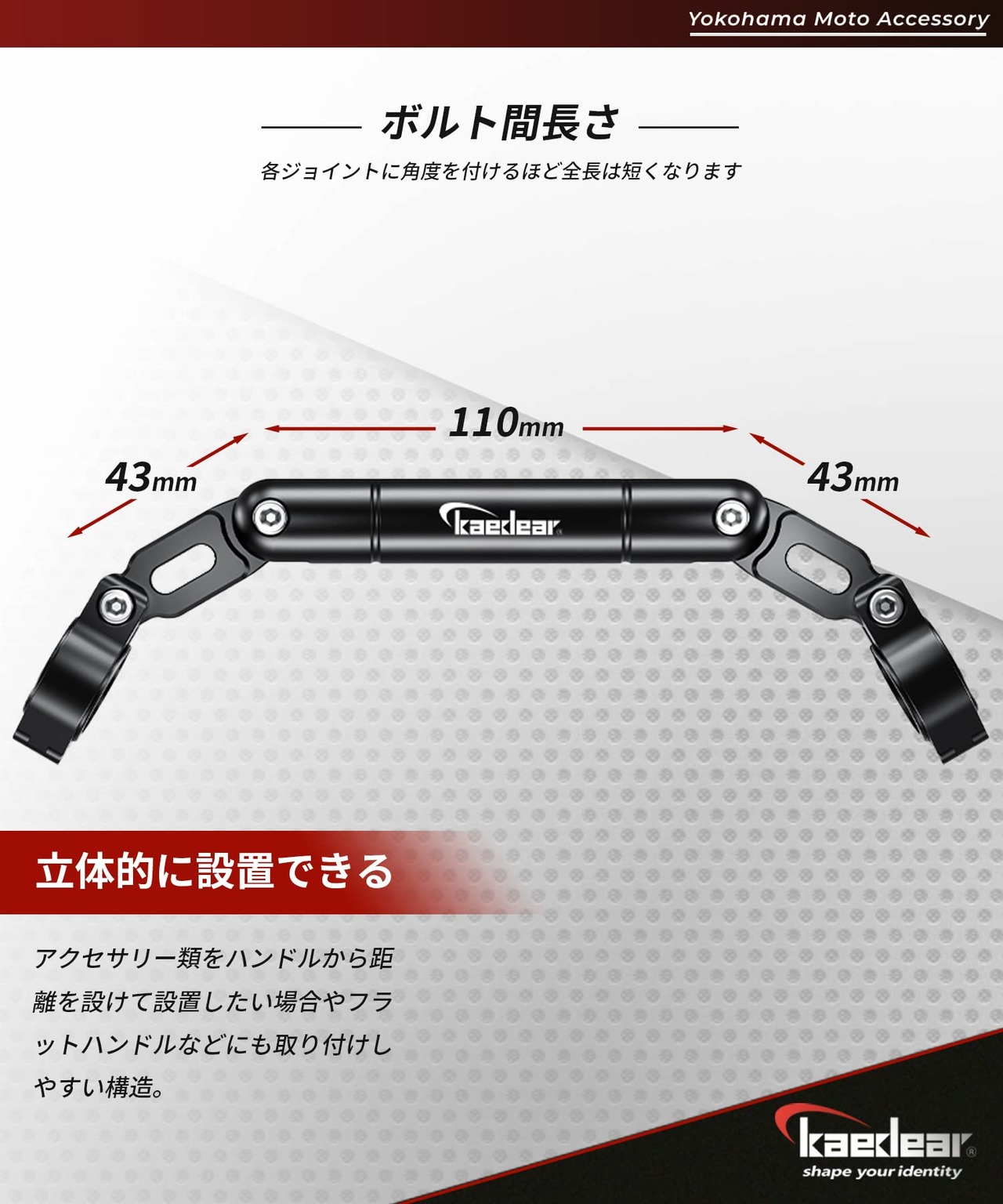 【商品詳細】 ■サイズ:取り付け径22mm、バー径22mm バー長さ:110mm、アーム長さ:43mm、全長160~235mm ■重量:186g ■材質:アルミニウム合金 ■内容:ダブルウィッシュバー一式、22mmアタッチメント、六角レンチ、取り扱い説明書
