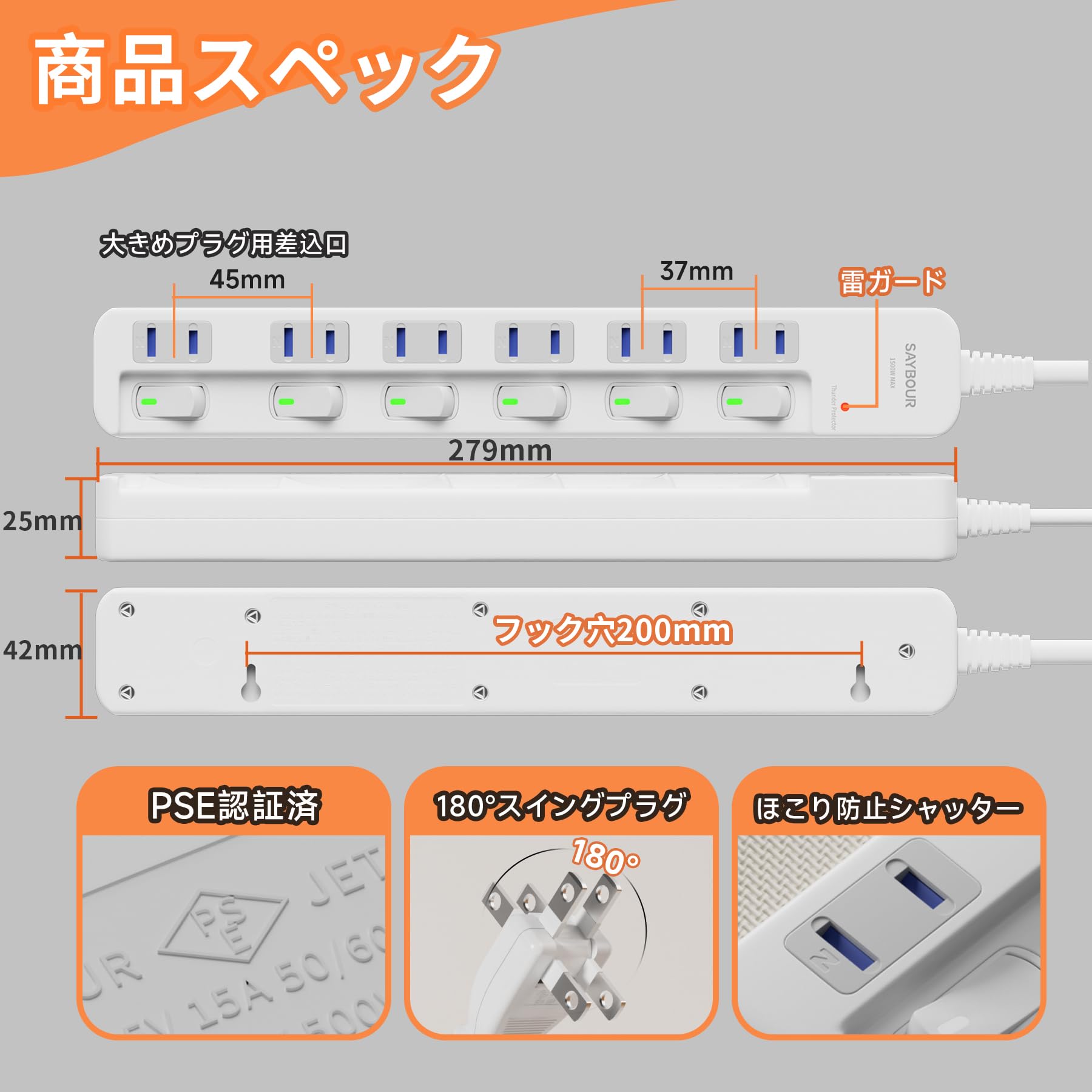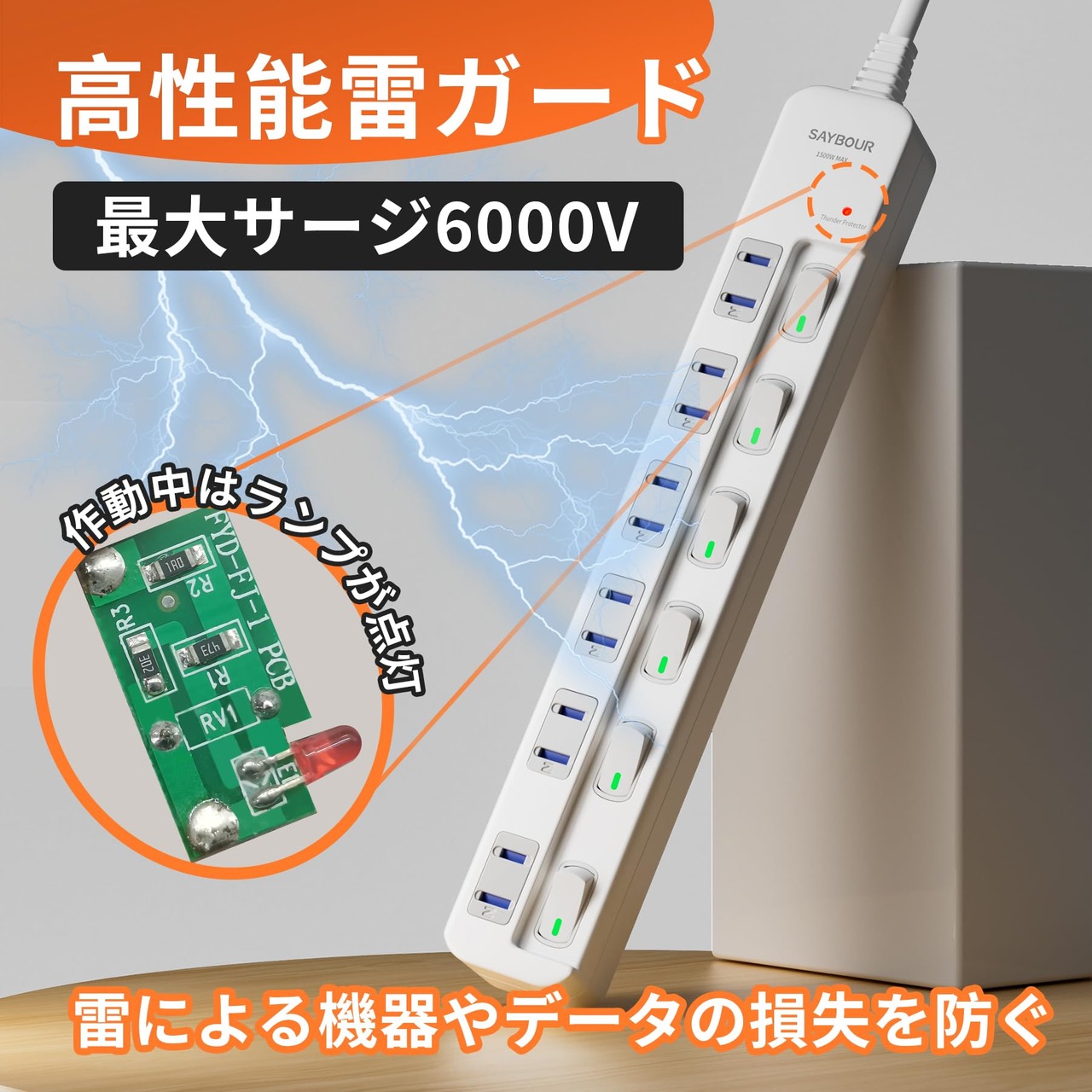SAYBOUR 電源タップ 雷ガード 個別スイッチ 節電タップ おしゃれ省エネACコンセント 6個口LED PSE認証済 延長コード (3m ホワイト)