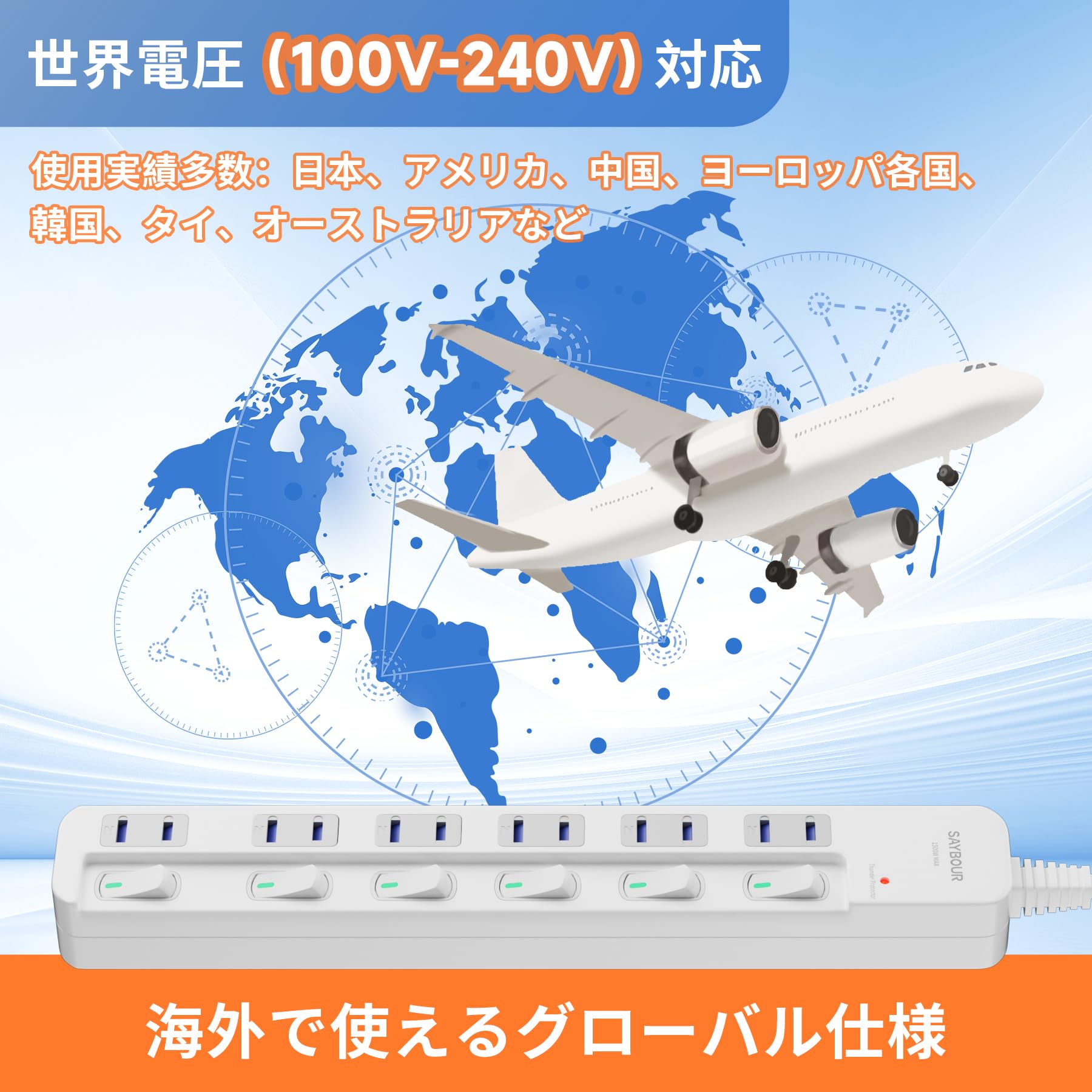 「240Vまで使用可能で海外旅行にも」世界各国の電圧に対応した電源タップ。コンセント数に対してコンパクトで軽量なので国内外の家族旅行におすすめ。※製品には法規に準じ国内家庭用電源の定格電圧「125V」と記載していますが、実際は100-240Vの範囲で安全にご使用いただけます。電源タップとしては変圧器不要ですが、変圧機能はございません。接続する製品の使用可能電圧を必ずご確認ください。