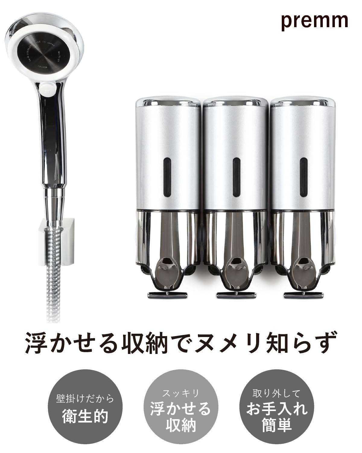 【累計10万本出荷】PREMM シャンプーディスペンサー マグネット シャンプーボトル 壁掛け (シルバー トリプル 500ml x 3)
