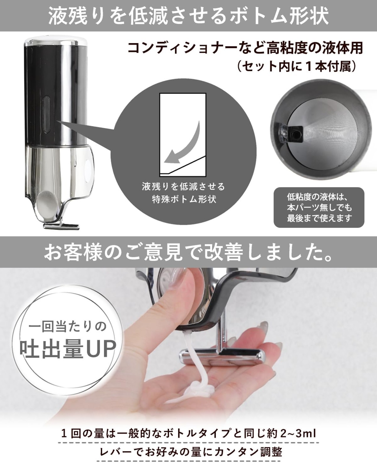 【片手で簡単操作】ただレバーを引くだけのシンプルな設計で、片手で簡単に操作可能です。 1回での吐出量は一般的なボトルタイプと同じ約2-3mlです。レバー式でお好みの量に簡単に調整可能です。