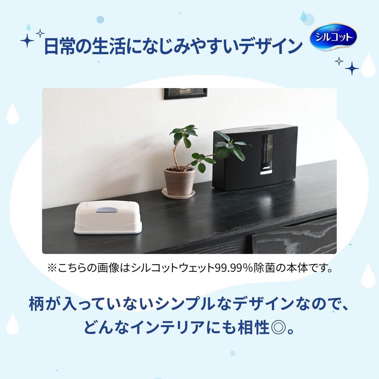 ワンプッシュでフタが開き、片手でシートが取り出せるシルコットウェットティッシュの詰め替え用です。