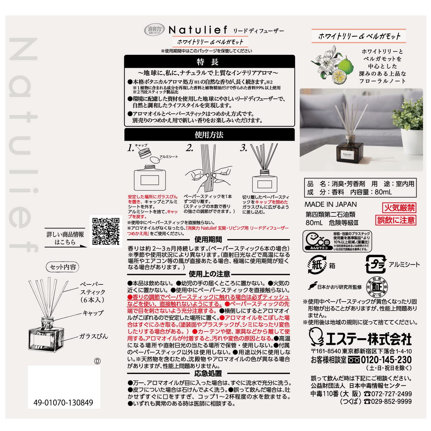 消臭力 ナチュリーフ 部屋用 リードディフューザー ホワイトリリー&ベルガモット 本体 80ml [日本製] 玄関 リビング用 ルームフレグランス 消臭 芳香剤